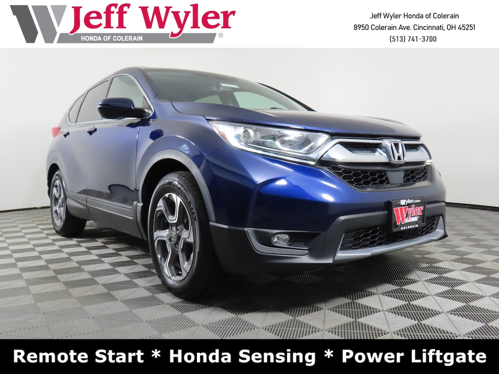 Jeff Wyler Honda of Colerain is very proud to offer this wonderful-looking 2019 Honda CR-V EX-L in Obsidian Blue Pearl. Well equipped with: 18" Alloy Wheels, 4-Wheel Disc Brakes, 5.64 Axle Ratio, 8 Speakers, ABS brakes, Air Conditioning, Alloy wheels, AM/FM radio: SiriusXM, Apple CarPlay/Android Auto, Auto High-beam Headlights, Auto-dimming Rear-View mirror, Automatic temperature control, Blind Spot Information (BSI) System warning, Brake assist, Bumpers: body-color, Compass, Delay-off headlights, Driver door bin, Driver vanity mirror, Dual front impact airbags, Dual front side impact airbags, Electronic Stability Control, Exterior Parking Camera Rear, Forward collision: Collision Mitigation Braking System (CMBS) + FCW mitigation, Four wheel independent suspension, Front anti-roll bar, Front Bucket Seats, Front Center Armrest, Front dual zone A/C, Front fog lights, Front reading lights, Fully automatic headlights, Garage door transmitter: HomeLink, Heated door mirrors, Heated Front Bucket Seats, Heated front seats, Illuminated entry, Lane departure: Lane Keeping Assist System (LKAS) active, Leather Seat Trim, Leather Shift Knob, Low tire pressure warning, Memory seat, Occupant sensing airbag, Outside temperature display, Overhead airbag, Overhead console, Panic alarm, Passenger door bin, Passenger vanity mirror, Power door mirrors, Power driver seat, Power Liftgate, Power moonroof, Power passenger seat, Power steering, Power windows, Radio data system, Radio: AM/FM/SiriusXM Audio System, Rear anti-roll bar, Rear seat center armrest, Rear window defroster, Rear window wiper, Remote keyless entry, Security system, Speed control, Speed-sensing steering, Speed-Sensitive Wipers, Split folding rear seat, Spoiler, Steering wheel mounted audio controls, Tachometer, Telescoping steering wheel, Tilt steering wheel, Traction control, Trip computer, Turn signal indicator mirrors, and Variably intermittent wipers.