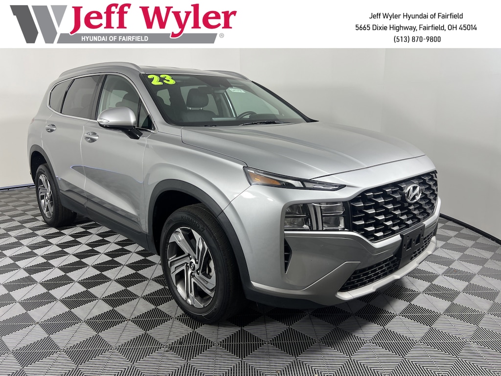 Clean CARFAX. Jeff Wyler Hyundai of Fairfield is delighted to offer this attractive 2023 Hyundai Santa Fe SEL in Shimmering Silver. Well equipped with: Option Group 01, AWD, Black, Android Auto, Apple CarPlay, CALL NOW FOR YOUR VIP APPOINTMENT 513-870-9800, FULLY SERVICED w/RECORDS, GUARANTEED FINANCING!! NO MATTER YOUR SITUATION WE CAN GET AN APPROVAL!!, THE #1 Volume dealer in the region! Come see why for yourself Today!!, WE PAY MORE FOR YOUR TRADE!!, 18" x 7.5J Alloy Wheels, 4-Wheel Disc Brakes, 6 Speakers, ABS brakes, Air Conditioning, Alloy wheels, AM/FM radio: SiriusXM, Apple CarPlay & Android Auto, Auto High-beam Headlights, Automatic temperature control, Axle Ratio: 4.081, Brake assist, Bumpers: body-color, Delay-off headlights, Driver door bin, Driver vanity mirror, Dual front impact airbags, Dual front side impact airbags, Electronic Stability Control, Emergency communication system, Exterior Parking Camera Rear, Four wheel independent suspension, Front anti-roll bar, Front Bucket Seats, Front Center Armrest, Front dual zone A/C, Front reading lights, Fully automatic headlights, Heated door mirrors, Heated Front Bucket Seats, Heated front seats, Illuminated entry, Leather steering wheel, Low tire pressure warning, Navigation System, Occupant sensing airbag, Outside temperature display, Overhead airbag, Overhead console, Panic alarm, Passenger door bin, Passenger vanity mirror, Power door mirrors, Power driver seat, Power Liftgate, Power steering, Power windows, Radio: AM/FM Display Audio, Rear anti-roll bar, Rear seat center armrest, Rear window defroster, Rear window wiper, Remote keyless entry, Security system, Speed control, Speed-sensing steering, Split folding rear seat, Spoiler, Stain-Resistant Cloth Seat Trim, Steering wheel mounted audio controls, Tachometer, Telescoping steering wheel, Tilt steering wheel, Traction control, Trip computer, Turn signal indicator mirrors, and Variably intermittent wipers. TO CHECK ON THE AVAILABILITY OF THIS VEHICLE REACH OUT TO ONE OF OUR TEAM MEMBERS!! ALSO SHOP ONLINE AT https://www.jeffwylerhyundaioffairfield.com/ Proudly Serving: Cincinnati, Dayton, Columbus, Louisville, Lexington, Indianapolis, Hamilton, Florence, Alexandria, Beavercreek, Springdale, West Chester, Monroe, Fairfield, Kenwood, Newport and all of greater Cincinnati Ohio, Indiana, and Northern Kentucky.