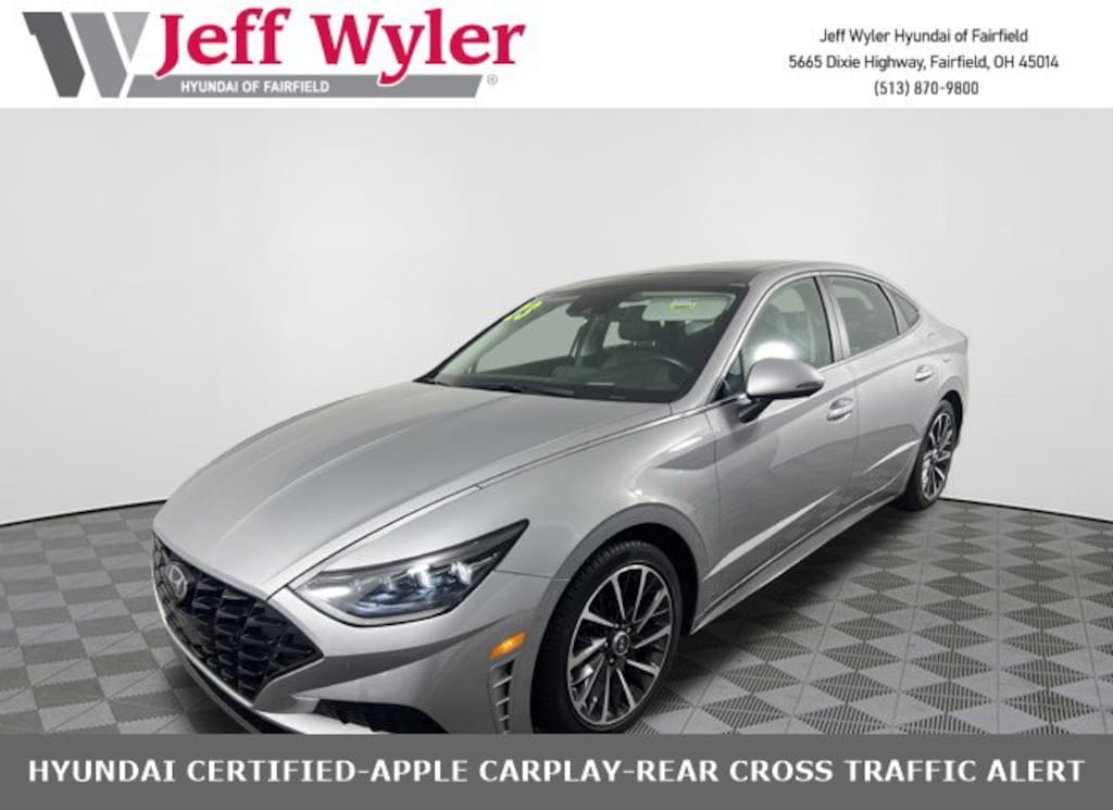 CARFAX One-Owner. Jeff Wyler Hyundai of Fairfield is pumped up to offer this charming 2023 Hyundai Sonata Limited in Curated Silver. Well equipped with: Cargo Package (Cargo Hook, Cargo Tray, and Trunk Cargo Net), Option Group 01, Hyundai Certified Used Vehicles Certified, Black Leather, Android Auto, Apple CarPlay, CALL NOW FOR YOUR VIP APPOINTMENT 513-870-9800, FULLY SERVICED w/RECORDS, GUARANTEED FINANCING!! NO MATTER YOUR SITUATION WE CAN GET AN APPROVAL!!, THE #1 Volume dealer in the region! Come see why for yourself Today!!, WE PAY MORE FOR YOUR TRADE!!, 12 Speakers, 18" x 7.5J Aluminum Alloy Wheels, 4-Wheel Disc Brakes, ABS brakes, Air Conditioning, Alloy wheels, AM/FM radio: SiriusXM, Apple CarPlay & Android Auto, Auto High-beam Headlights, Auto-dimming Rear-View mirror, Automatic temperature control, Brake assist, Bumpers: body-color, Carpeted Floor Mats, Delay-off headlights, Driver door bin, Driver vanity mirror, Dual front impact airbags, Dual front side impact airbags, Electronic Stability Control, Emergency communication system: Blue Link Connected Car Service (3-year complimentary subscription), Exterior Parking Camera Rear, Four wheel independent suspension, Front anti-roll bar, Front Bucket Seats, Front Center Armrest, Front dual zone A/C, Front reading lights, Fully automatic headlights, Garage door transmitter: HomeLink, Heads-Up Display, Heated door mirrors, Heated front seats, Heated steering wheel, Heated/Ventilated Front Bucket Seats, Illuminated entry, Knee airbag, Leather Seating Surfaces, Leather steering wheel, Low tire pressure warning, Memory seat, Navigation System, Occupant sensing airbag, Outside temperature display, Overhead airbag, Overhead console, Panic alarm, Passenger door bin, Passenger vanity mirror, Power door mirrors, Power driver seat, Power moonroof, Power passenger seat, Power steering, Power windows, Radio data system, Radio: AM/FM/MP3/HD/SiriusXM Display Audio w/Nav, Rain sensing wipers, Rear anti-roll bar, Rear seat center armrest, Rear side impact airbag, Rear window defroster, Remote keyless entry, Security system, Speed control, Speed-sensing steering, Speed-Sensitive Wipers, Split folding rear seat, Steering wheel mounted audio controls, Tachometer, Telescoping steering wheel, Tilt steering wheel, Traction control, Trip computer, Turn signal indicator mirrors, Variably intermittent wipers, and Ventilated front seats. Certified. Hyundai Certified Used Vehicles Details: * Vehicle History * Includes 10-year/Unlimited Mileage Roadside Assistance with Rental Car and Trip Interruption Reimbursement; Please See Dealers for Specific Vehicle Eligibility Requirements. 10-Year/100,000 Mile Hybrid/EV Battery Warranty. 3-Months SiriusXM Trial Subscription. Complimentary 1 Year (Connected Care & Remote Pkgs). * Powertrain Limited Warranty: 120 Month/100,000 Mile (whichever comes first) from original in-service date * Roadside Assistance * 173+ Point Inspection * Warranty Deductible: $50 * Limited Warranty: 60 Month/60,000 Mile (whichever comes first) from original in-service dateTO CHECK ON THE AVAILABILITY OF THIS VEHICLE REACH OUT TO ONE OF OUR TEAM MEMBERS!! ALSO SHOP ONLINE AT https://www.jeffwylerhyundaioffairfield.com/ Proudly Serving: Cincinnati, Dayton, Columbus, Louisville, Lexington, Indianapolis, Hamilton, Florence, Alexandria, Beavercreek, Springdale, West Chester, Monroe, Fairfield, Kenwood, Newport and all of greater Cincinnati Ohio, Indiana, and Northern Kentucky.