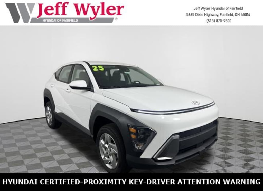 CARFAX One-Owner. Clean CARFAX. Jeff Wyler Hyundai of Fairfield is pumped up to offer this great 2025 Hyundai Kona SE in Atlas White. Well equipped with: Option Group 01, Hyundai Combined Certified, Android Auto, Apple CarPlay, CALL NOW FOR YOUR VIP APPOINTMENT 513-870-9800, GUARANTEED FINANCING!! NO MATTER YOUR SITUATION WE CAN GET AN APPROVAL!!, THE #1 Volume dealer in the region! Come see why for yourself Today!!, 4-Wheel Disc Brakes, 6 Speakers, ABS brakes, Air Conditioning, Alloy wheels, AM/FM radio: SiriusXM, Apple CarPlay & Android Auto, Auto High-beam Headlights, Brake assist, Bumpers: body-color, Cargo Tray, Carpeted Floor Mats, Cloth Seat Trim, Delay-off headlights, Driver door bin, Driver vanity mirror, Dual front impact airbags, Dual front side impact airbags, Electronic Stability Control, Emergency communication system: Bluelink+, Exterior Parking Camera Rear, Four wheel independent suspension, Front anti-roll bar, Front Bucket Seats, Front Center Armrest, Front reading lights, Fully automatic headlights, Illuminated entry, Lifestyle Hitch, Low tire pressure warning, Occupant sensing airbag, Outside temperature display, Overhead airbag, Panic alarm, Passenger door bin, Passenger vanity mirror, Power door mirrors, Power steering, Power windows, Radio: AM/FM/HD Radio/SiriusXM Audio System, Rear anti-roll bar, Rear seat center armrest, Rear window defroster, Rear window wiper, Remote keyless entry, Security system, Speed control, Speed-sensing steering, Split folding rear seat, Spoiler, Steering wheel mounted audio controls, Tachometer, Telescoping steering wheel, Tilt steering wheel, Traction control, Trip computer, Variably intermittent wipers, and Wheels: 17" x 7.0J Steel Gray Alloy. Certified. Hyundai Combined Details: * Roadside Assistance (for Hyundai Certified Used Vehicles program) * Warranty Deductible: $50 (for Hyundai Certified Used Vehicles program) * 173+ Point Inspection (for Hyundai Certified Used Vehicles program), 117 Point Inspection (for Hyundai Select Used program) * Vehicle History (for Hyundai Certified Used Vehicles program) * Includes 10-year/Unlimited Mileage Roadside Assistance with Rental Car and Trip Interruption Reimbursement; Please See Dealers for Specific Vehicle Eligibility Requirements. 10-Year/100,000 Mile Hybrid/EV Battery Warranty. 3-Months SiriusXM Trial Subscription. Complimentary 1 Year (Connected Care & Remote Pkgs). (for Hyundai Certified Used Vehicles program), 6 Model Years Old and Newer With 80,000 - 120,000 Miles, 7-10 Model Years Old Vehicles With 120,000 Miles or Less. Powertrain Warranty 90 Days/5,000 Miles, HEV/PHEV Battery Warranty 10 Years/100,000 Miles. Roadside Assistance 90 Days/Unlimited Miles. Rental Car $35/Day Up to 5 Days. 3-Months SiriusXM Trial Subscription. (for Hyundai Select Used program) * Limited Warranty: 60 Month/60,000 Mile (whichever comes first) from original in-service date (for Hyundai Certified Used Vehicles program) * Powertrain Limited Warranty: 120 Month/100,000 Mile (whichever comes first) from original in-service date (for Hyundai Certified Used Vehicles program)TO CHECK ON THE AVAILABILITY OF THIS VEHICLE REACH OUT TO ONE OF OUR TEAM MEMBERS!! ALSO SHOP ONLINE AT https://www.jeffwylerhyundaioffairfield.com/ Proudly Serving: Cincinnati, Dayton, Columbus, Louisville, Lexington, Indianapolis, Hamilton, Florence, Alexandria, Beavercreek, Springdale, West Chester, Monroe, Fairfield, Kenwood, Newport and all of greater Cincinnati Ohio, Indiana, and Northern Kentucky.