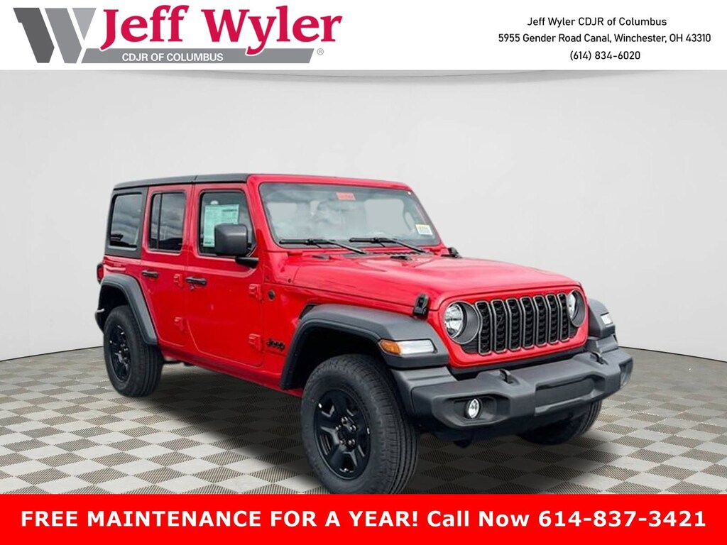 Jeff Wyler Columbus Auto Mall is pumped up to offer this good-looking and fun 2025 Jeep Wrangler Sport in Firecracker Red Clearcoat. Well equipped with: Quick Order Package 22B Sport, 110 MPH Vehicle Max Speed Calibration, 3.45 Overall Top Gear Ratio, 4-Wheel Disc Brakes, 8 Speakers, ABS brakes, Air Conditioning, AM/FM radio: SiriusXM, Apple CarPlay/Android Auto, Aux Battery, Black 3-Piece Hard Top, Brake assist, Cloth Low-Back Bucket Seats, Compass, Deep Tint Sunscreen Windows, Delay-off headlights, Driver door bin, Driver vanity mirror, Dual front impact airbags, Dual front side impact airbags, Electronic Stability Control, Freedom Panel Storage Bag, Front anti-roll bar, Front Bucket Seats, Front Center Armrest w/Storage, Front fog lights, Front reading lights, Illuminated entry, Integrated roll-over protection, Low tire pressure warning, MOPAR All-Weather Floor Mats, Non-Lock Fuel Cap w/o Discriminator, Normal Duty Suspension, Occupant sensing airbag, Outside temperature display, Overhead airbag, Panic alarm, ParkView Rear Back-Up Camera, Passenger door bin, Passenger vanity mirror, Power steering, Power windows, Radio data system, Radio: Uconnect 5 w/12.3" Display, Rear anti-roll bar, Rear reading lights, Rear Window Defroster, Rear Window Wiper/Washer, Remote keyless entry, Speed control, Split folding rear seat, Steering wheel mounted audio controls, Stop-Start Dual Battery System, Tachometer, Telescoping steering wheel, Tilt steering wheel, Traction control, Trip computer, Variably intermittent wipers, and Wheels: 17" x 7.5" Black Steel Styled.Wyler Family First Package Includes: NanoCure Appearance Protection: Exterior & Interior Chemical Sealant Applied to Protect Against Environmental Hazards (7 Year Warranty Coverage). Pulse- Rear End Collision Avoidance System Theft Deterrent Strategy gives you 5 Years of Coverage against vehicle theft, Offering up to a $5,000 benefit. Price does not include Tax, Title, License and Documentary Fee$2500 - 2025 National Retail Bonus Cash . Exp. 11/03/2025 $500 - 2025 National 2025 Military Bonus Cash. Exp. 01/05/2026