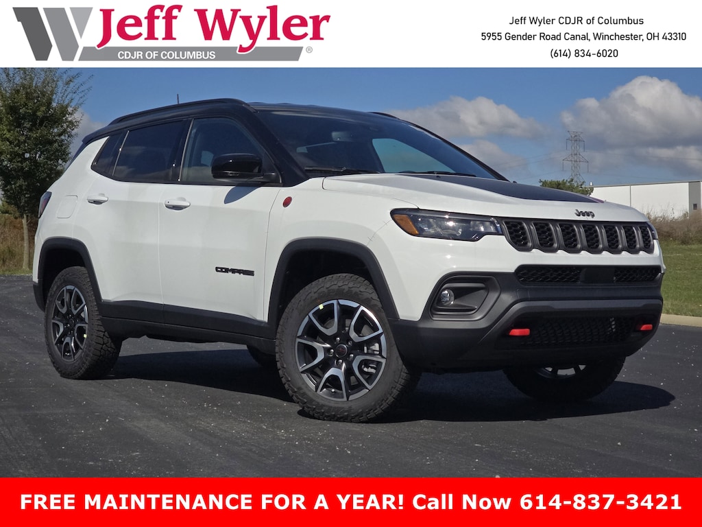 Jeff Wyler Columbus Auto Mall is honored to offer this terrific 2026 Jeep Compass Trailhawk in Bright White Clearcoat. Well equipped with: Quick Order Package 29E, 4WD, 4-Wheel Disc Brakes, 4.398 Final Drive Ratio, 6 Speakers, ABS brakes, Active Cruise Control, Air Conditioning, Alloy wheels, AM/FM radio: SiriusXM with 360L, Anti-whiplash front head restraints, Apple CarPlay/Android Auto, Auto High-beam Headlights, Auto-dimming Rear-View mirror, Automatic temperature control, Brake assist, Bumpers: body-colour, Compass, Delay-off headlights, Driver door bin, Driver vanity mirror, Dual front impact airbags, Dual front side impact airbags, Electronic Stability Control, Emergency communication system: SiriusXM Guardian, Four wheel independent suspension, Front anti-roll bar, Front Bucket Seats, Front dual zone A/C, Front fog lights, Front reading lights, Fully automatic headlights, Heated door mirrors, Heated front seats, Heated steering wheel, Illuminated entry, Knee airbag, Leather Shift Knob, Leather steering wheel, Low tire pressure warning, Occupant sensing airbag, Outside temperature display, Overhead airbag, Overhead console, Panic alarm, ParkView Rear Back-Up Camera, Passenger door bin, Passenger vanity mirror, Power door mirrors, Power driver seat, Power Liftgate, Power steering, Power windows, Premium audio system: UConnect 5, Premium Cloth/Leather-Faced Bucket Seats, Radio: Uconnect 5 w/10.1" Display, Rain sensing wipers, Rear anti-roll bar, Rear window defroster, Rear window wiper, Remote keyless entry, Security system, Speed control, Split folding rear seat, Spoiler, Steering wheel mounted audio controls, Tachometer, Telescoping steering wheel, Tilt steering wheel, Traction control, Turn signal indicator mirrors, Variably intermittent wipers, and Wheels: 17" x 6.5" Painted Black Aluminum. 23/31 City/Highway MPGWyler Family First Package Includes: NanoCure Appearance Protection: Exterior & Interior Chemical Sealant Applied to Protect Against Environmental Hazards (7 Year Warranty Coverage). Pulse- Rear End Collision Avoidance System Theft Deterrent Strategy gives you 5 Years of Coverage against vehicle theft, Offering up to a $5,000 benefit.