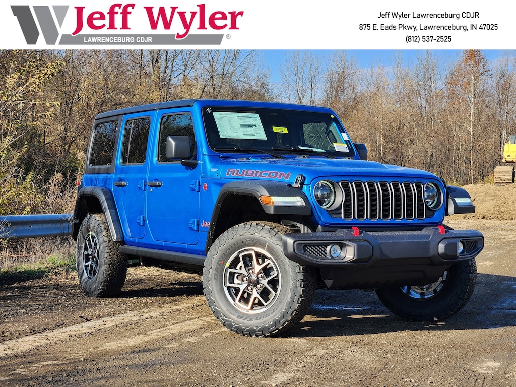 Jeff Wyler Chrysler Dodge Jeep of Lawrenceburg is excited to offer this attractive-looking and fun 2026 Jeep Wrangler Rubicon in Hydro Blue Pearl Coat. Well equipped with: Convenience Group (Heated Front Seats, Heated Steering Wheel, Remote Start System, and Universal Garage Door Opener), Dual Top Group (Premium Black Sunrider Soft Top w/Dual Top Group), Quick Order Package 24R Rubicon, 12.3" Touchscreen Display, 4-Wheel Disc Brakes, 4.10 Rear Axle Ratio, 4G LTE Wi-Fi Hot Spot, 8 Speakers, ABS brakes, Air Conditioning, Alloy wheels, AM/FM radio: SiriusXM with 360L, Apple CarPlay, Apple CarPlay/Android Auto, Automatic temperature control, Aux Battery, Black 3-Piece Hard Top, Brake assist, Cloth Low-Back Bucket Seats, Compass, Connectivity - US/Canada, Delay-off headlights, Driver door bin, Driver vanity mirror, Dual front impact airbags, Dual front side impact airbags, Electronic Stability Control, Emergency communication system: Jeep Connect, For More Info, Call 800-643-2112, Freedom Panel Storage Bag, Front anti-roll bar, Front Bucket Seats, Front Center Armrest w/Storage, Front dual zone A/C, Front fog lights, Front reading lights, Fully automatic headlights, Google Android Auto, Heated door mirrors, Illuminated entry, Integrated Center Stack Radio, Integrated roll-over protection, Jeep Trail Rated Kit, Low tire pressure warning, MOPAR All-Weather Floor Mats, Non-Lock Fuel Cap w/o Discriminator, Occupant sensing airbag, Outside temperature display, Overhead airbag, Panic alarm, ParkView Rear Back-Up Camera, Passenger door bin, Passenger vanity mirror, Performance Suspension, Power door mirrors, Power steering, Power windows, Radio data system, Radio: Uconnect 5 w/12.3" Display, Rear anti-roll bar, Rear reading lights, Rear Window Defroster, Rear Window Wiper/Washer, Remote keyless entry, Security system, SiriusXM Radio Service, SiriusXM w/360L, Speed control, Split folding rear seat, Steering wheel mounted audio controls, Stop-Start Dual Battery System, Tachometer, Telescoping steering wheel, Tilt steering wheel, Traction control, Trip computer, Variably intermittent wipers, Voltmeter, and Wheels: 17" x 7.5" Machined/Painted Black.Wyler Family First Package Includes: NanoCure Appearance Protection: Exterior & Interior Chemical Sealant Applied to Protect Against Environmental Hazards (7 Year Warranty Coverage). Pulse- Rear end Collision Avoidance System Theft Deterrent Strategy gives you 5 Years of Coverage against vehicle Theft, Offering up to a $5,000 benefit. Used vehicles 10 years of age or newer with less than 100,000 miles are eligible for the Wyler Assurance Program, but eligible vehicles must pass our reconditioning process and multi-point inspection. Provided the vehicle passes inspection, vehicles will be eligible for the 6 month/6,000 mile limited warranty. The 6 month/6,000 mile limited warranty is NOT available on AS-IS vehicles, wholesale vehicles, lease buyback/pass-thru vehicles or un-inspected vehicles. Note that this program can also apply to vehicles where the remaining factory coverage is less than 6 months or 6,000 miles. Please check the Federal Trade Commission (FTC) Buyers guide on the vehicle for full details as to whether or not warranty coverage may apply. Contact Dealer for additional details.The Wyler Assurance 6 month/6,000 Mile limited warranty ends 6 months from the date of the Retail Purchase Agreement (BUYERS ORDER) or when the vehicle's odometer registers 6,000 additional miles to the mileage listed on the BUYERS ORDER, whichever comes first. Your Deductible - The warranty holder on your contract pays the first $100 of each covered repair. Price includes: $1500 - 2026 National Retail Bonus Cash . Exp. 12/01/2025