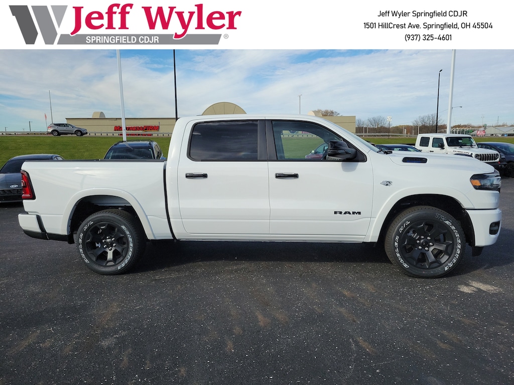 Jeff Wyler Springfield Auto Mall is pleased to offer this terrific 2026 Ram 1500 Big Horn/Lone Star in Bright White Clearcoat. Well equipped with: Big Horn Level 2 Equipment Group (115V Auxiliary Power Outlet, 115V Auxiliary Rear Power Outlet, 12" Touchscreen Display, 2nd Row In Floor Storage Bins, 3 Rear Seat Head Restraints, 4 Way Front Headrests, 400W Inverter, 4G LTE Wi-Fi Hot Spot, 9 Amplified Speakers w/Subwoofer, Air Conditioning ATC w/Dual Zone Control, Apple CarPlay, Auto Power-Folding Mirrors, Auto-Dimming Exterior Driver Mirror, Auto-Dimming Rear-View Mirror, Black Exterior Mirrors, Black Premium Power Mirrors, Body Color Fender Flares, Bucket Seats, Center Console Parts Module, Cluster 7.0" TFT Color Display, Configurable Drive Mode, Connected Travel & Traffic Services, Connectivity - US/Canada, Convex Wide-Angle Exterior Mirror Insert, Deluxe Cloth Bucket Seats, Disassociated Touchscreen Display, Exterior Mirrors Courtesy Lamps, Exterior Mirrors w/Heating Element, Exterior Mirrors w/Supplemental Signals, Front Seat Back Map Pockets, Full Length Floor Console, Global Telematics Box Module (TBM), Glove Box Lamp, Google Android Auto, GPS Antenna Input, GPS Navigation, HD Radio, Heated Front Seats, Heated Steering Wheel, Integrated Center Stack Radio, Integrated Voice Command w/Bluetooth, Leather Wrapped Steering Wheel, LED Dome Lamp w/On/Off Switch, LED Footwell Lighting, Manual Adjust 4-Way Front Passenger Seat, Media Hub w/2 Charge Only USBs, Overhead LED Lamps, Power 2-Way Driver Lumbar Adjust, Power Adjust 8-Way Driver Seat, Power Adjustable Pedals, Premium Overhead Console, Radio: Uconnect 5 Nav w/12.0" Display, Rear 60/40 Folding Seat, Rear Center Armrest, Rear Power Sliding Window, Rear Window Defroster, Remote Tailgate Release, Security Alarm, SiriusXM Radio Service, SiriusXM w/360L, Steering Wheel Mounted Audio Controls, Sun Visors w/Illuminated Vanity Mirrors, Universal Garage Door Opener, USB Host Flip, and Wheels: 20" x 9" Aluminum Chrome Clad (WRK)), Night Edition (Accent Color Door Handles, Accent Color Premium Power Mirrors, Accent Color Tailgate Handle, Anti-Spin Differential Rear Axle, Black Exterior Truck Badging, Black Headlamp Bezels, Black Interior Accents, Black Painted Exterior Mirrors Caps, Black Tail Lamp Bezels, Body Color Front Bumper, Body Color Rear Bumper w/Step Pads, Dual Exhaust w/Black Tips, Grille Black Surround Black Mesh, RAM Grille Badge - Black, and Wheels: 20" x 9.0" Aluminum Painted Clad), Quick Order Package 27Z Big Horn, 33 Gallon Fuel Tank, 4-Wheel Disc Brakes, 48V Belt Starter Generator, 6 Speakers, ABS brakes, Air Conditioning, Alloy wheels, AM/FM radio, Apple CarPlay/Android Auto, Auto High-beam Headlights, Brake assist, Bumpers: chrome, Cloth Bucket Seats, Cluster 12" TFT Color Display, Compass, Delay-off headlights, Dome Dual LED Reading Lamp, Driver door bin, Dual front impact airbags, Dual front side impact airbags, Dual-Pane Panoramic Sunroof, Electronic Stability Control, Front anti-roll bar, Front Bucket Seats, Front Center Armrest w/Storage, Front fog lights, Front License Plate Bracket, Front reading lights, Front wheel independent suspension, Fully automatic headlights, Heated door mirrors, Illuminated entry, Low tire pressure warning, Manual Adjust 4-Way Driver Seat, Manual Folding Exterior Mirrors, MOPAR Front & Rear Rubber Floor Mats, Occupant sensing airbag, Outside temperature display, Overhead airbag, Overhead console, Panic alarm, ParkView Rear Back-Up Camera, Passenger door bin, Passenger vanity mirror, Power door mirrors, Power steering, Power windows, Radio data system, Radio: Uconnect 5 W w/8.4" Display, RAM Grille Badge - Chrome, Rear anti-roll bar, Rear step bumper, Remote keyless entry, Speed control, Supplier Part Tracking (J-1), Tachometer, Telescoping steering wheel, Tilt steering wheel, Traction c Available Incentives: $3500 - 2026 National Retail Consumer Cash . Exp. 12/01/2025 $500 - 2026 National 2026 Military Bonus Cash . Exp. 01/05/2026