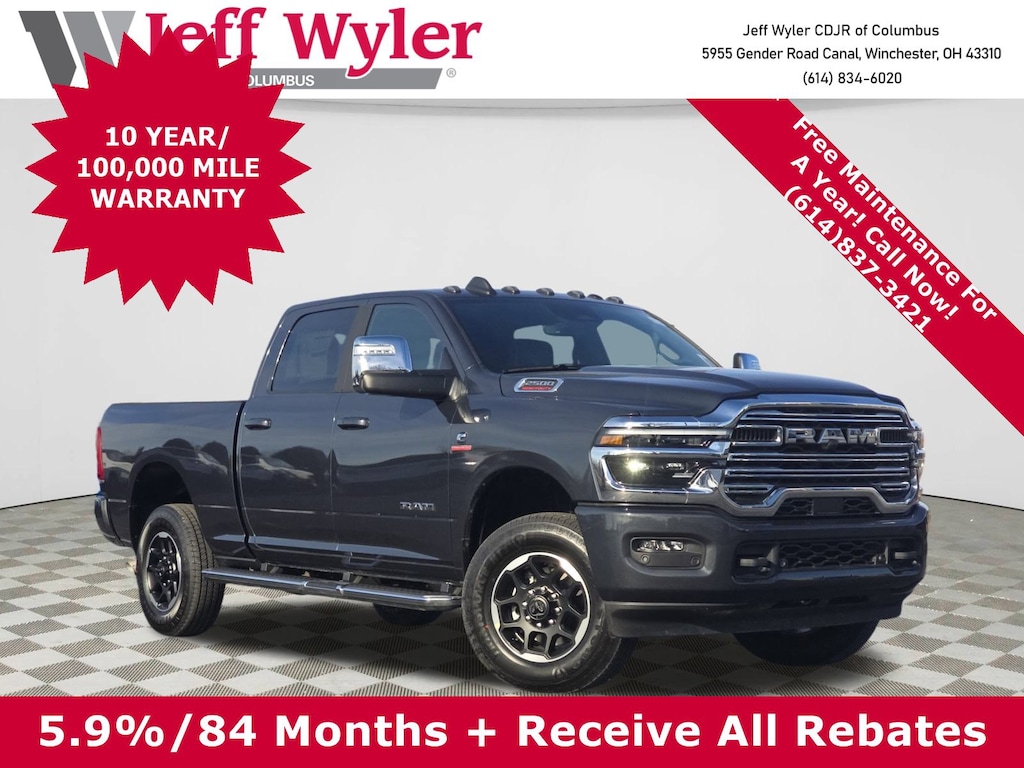 Jeff Wyler Columbus Auto Mall is proud to offer this terrific 2026 Ram 2500 Laramie in Forged Blue Metallic. Well equipped with: Cold Weather Group (Engine Block Heater and MOPAR Winter Front Grille Cover), Laramie Level 1 Equipment Group (2nd Row in Floor Storage Bins, Anti-Spin Differential Rear Axle, Auto Adjust in Reverse Exterior Mirrors, Auto Dim Exterior Mirror, Auto High Beam Headlamp Control, Auto Power-Folding Mirrors, Auto-Dimming Exterior Passenger Mirror, Chrome Exterior Mirrors, Exterior Mirrors Courtesy Lamps, Exterior Mirrors with Heating Element, Exterior Mirrors with Memory, Exterior Mirrors with Supplemental Signals, Foam Bottle Insert (door Trim Panel), Forward and Reverse Utility Lights, Mirror Running Lights, Power Adjust Mirrors, Power Adjustable Pedals with Memory, Power Heated Fold Telescopic Mirrors with Memory, Power Telescoping Mirrors, Power-Adjustable Convex Aux Mirrors, Rain Sensitive Windshield Wipers, and Remote Tailgate Release), Quick Order Package 24H Laramie, #1 Seat Foam Cushion, 10 Speakers, 115V Auxiliary Rear Power Outlet, 2 Way Rear Headrest Seat, 4 Way Front Headrests, 4-Wheel Disc Brakes, 4G LTE Wi-Fi Hot Spot, 5th Wheel/Gooseneck Towing Prep Group, ABS brakes, Air Conditioning, Alexa Built-in, Alloy wheels, AM/FM radio: SiriusXM with 360L, Apple CarPlay, Apple CarPlay/Android Auto, Auto-dimming Rear-View mirror, Automatic temperature control, Black Wheel Center Hub, Brake assist, Bumpers: body-color, Chrome Flat Wheel-to-Wheel Side Steps, Clearance Lamps, Compass, Connected Travel and Traffic Services, Connectivity - US/Canada, Delay-off headlights, Disassociated Touchscreen Display, Driver door bin, Driver vanity mirror, Dual front impact airbags, Dual front side impact airbags, Electronic Stability Control, Emergency Vehicle Alert System (EVAS), Folding Flat Load Floor Storage, For Details, Visit DriveUconnect.com, For More Info, Call 800-643-2112, Front anti-roll bar, Front Center Armrest w/Storage, Front dual zone A/C, Front fog lights, Front License Plate Bracket, Front reading lights, Front Seat Back Map Pockets, Fully automatic headlights, Garage door transmitter, Global Telematics Box Module, Google Android Auto, GPS Antenna Input, GPS Navigation, HD Radio, Heated door mirrors, Heated Front Seats, Heated front seats, Heated Steering Wheel, Heated steering wheel, High Back Seats, Illuminated entry, Integrated Voice Command with Bluetooth, Leather Trim 40/20/40 Bench Seat, Low tire pressure warning, MOPAR Front and Rear Rubber Floor Mats, MyFlexCare Service Diesel, Navigation System, Occupant sensing airbag, Off-Road Info Pages, Outside temperature display, Overhead airbag, Overhead console, Panic alarm, ParkView Rear Back-Up Camera, Passenger door bin, Passenger vanity mirror, Power 2-Way Driver Lumbar Adjust, Power 2-Way Passenger Lumbar Adjust, Power Adjust 8-Way Driver Seat, Power Adjust 8-Way Front Passenger Seat, Power door mirrors, Power driver seat, Power passenger seat, Power steering, Power windows, Radio data system, Radio: Uconnect 5 Navigation with 12.0" Display, Rear 60/40 Folding Seat, Rear anti-roll bar, Rear reading lights, Rear seat center armrest, Rear step bumper, Rear window defroster, Remote keyless entry, Security system, Selectable Tire Fill Alert, SiriusXM Radio Service, SiriusXM with 360L, Speed control, Split folding rear seat, Steering wheel mounted audio controls, Tachometer, Tilt steering wheel, Traction control, Trailer Tow Pages, Trip computer, Turn signal indicator mirrors, Variably intermittent wipers, Voltmeter, and Wheels: 18" x 8.0" Diamond Cut Aluminum with Black Pt PocketS.Wyler Family First Package Includes: NanoCure Appearance Protection: Exterior & Interior Chemical Sealant Applied to Protect Against Environmental Hazards (7 Year Warranty Coverage). Pulse- R Price does not include Tax, Title, License and Documentary Fee$1000 - 2026 National Bonus Cash . Exp. 03/31/2026 $500 - 2026 National 2026 Military Bonus Cash . Exp. 01/04/2027