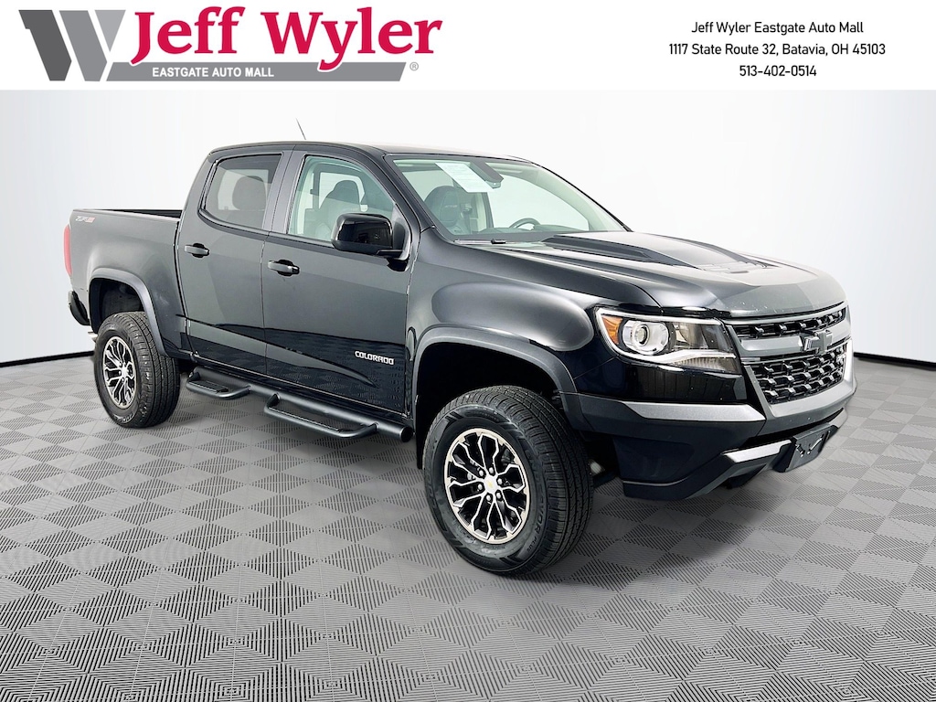 Jeff Wyler Eastgate Auto Mall is pleased to offer this charming 2018 Chevrolet Colorado ZR2 in Black. Well equipped with: Heavy-Duty Trailering Package, Off-Road Appearance Package, Preferred Equipment Group 4ZR (Black Rear Bumpers, Black Spray-On Bedliner w/Chevrolet Logo, Driver-Selectable Full-Locking Front Differential, Driver-Selectable Full-Locking Rear Differential, and Integrated Trailer Brake Controller), 17" x 8" Aluminum Wheels, 3.42 Rear Axle Ratio, 4-Way Power Front Passenger Seat Adjuster, 4-Wheel Disc Brakes, 6 Speakers, 6-Speaker Audio System Feature, ABS brakes, Air Conditioning, Alloy wheels, AM/FM radio: SiriusXM, Apple CarPlay, Auto-dimming Rear-View mirror, Automatic temperature control, Compass, Delay-off headlights, Driver 4-Way Power Seat Adjuster, Driver door bin, Driver vanity mirror, Dual front impact airbags, Dual front side impact airbags, Electronic Stability Control, Exterior Parking Camera Rear, Front anti-roll bar, Front Bucket Seats, Front Center Armrest, Front fog lights, Front License Plate Kit, Front reading lights, Front wheel independent suspension, Fully automatic headlights, Heated door mirrors, Heated Driver & Front Passenger Seats, Heated front seats, Hitch Guidance, Illuminated Black Bowtie Emblem (LPO), Illuminated entry, Leather-Appointed Seat Trim, Low tire pressure warning, Occupant sensing airbag, Outside temperature display, Overhead airbag, Overhead console, Panic alarm, Passenger door bin, Passenger vanity mirror, Power door mirrors, Power Driver Lumbar Control Seat Adjuster, Power driver seat, Power Passenger Lumbar Control Seat Adjuster, Power passenger seat, Power steering, Power windows, Premium audio system: Chevrolet MyLink, Radio data system, Radio: AM/FM Stereo w/8" Diagonal Color Touch Screen, Rear reading lights, Rear seat center armrest, Rear step bumper, Rear window defroster, Remote keyless entry, Security system, SiriusXM Satellite Radio, Speed control, Speed-sensing steering, Steering wheel mounted audio controls, Tachometer, Telescoping steering wheel, Tilt steering wheel, Tow/Haul Mode, Traction control, Trip computer, and Variably intermittent wipers. CARFAX One-Owner. Clean CARFAX. Awards: * 2018 KBB.com Best Resale Value Awards * 2018 KBB.com 10 Most Awarded Brands Ask about available certifications. Used vehicles 10 years of age or newer with less than 100,000 miles are eligible for the Wyler Assurance Program, but eligible vehicles must pass our reconditioning process and multi-point inspection. Provided the vehicle passes inspection, vehicles will be eligible for the 6 month/6,000 mile limited warranty. The 6 month/6,000 mile limited warranty is NOT available on AS-IS vehicles, wholesale vehicles, lease buyback/pass-thru vehicles or un-inspected vehicles. Note that this program can also apply to vehicles where the remaining factory coverage is less than 6 months or 6,000 miles. Please check the Federal Trade Commission (FTC) Buyers guide on the vehicle for full details as to whether or not warranty coverage may apply. Contact Dealer for additional details. The Wyler Assurance 6 month/6,000 Mile limited warranty ends 6 months from the date of the Retail Purchase Agreement (BUYERS ORDER) or when the vehicle's odometer registers 6,000 additional miles to the mileage listed on the BUYERS ORDER, whichever comes first. Your Deductible - The warranty holder on your contract pays the first $100 of each covered repair.