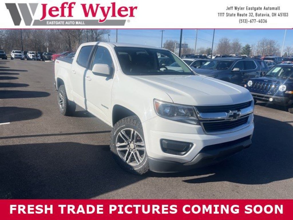 Jeff Wyler Eastgate Auto Mall is pumped up to offer this beautiful 2019 Chevrolet Colorado Work Truck in Summit White. Well equipped with: Black Bowtie Emblem Package (LPO), Custom Special Edition (Body-Color Door Handles, Body-Color Grille, Outside Power-Adjustable Body-Color Mirrors, Rear Body-Color Bumper, and Wheels: 18" x 8.5" Dark Argent Metallic Cast Alloy), Heavy-Duty Trailering Package, OnStar & Chevrolet Connected Services Capable (Chevrolet 4G LTE and Chevrolet Connected Access), Preferred Equipment Group 4WT, WT Convenience Package (Electronic Automatic Cruise Control, Extended Range Remote Keyless Entry, EZ-Lift & Lower Tailgate, and Unauthorized Entry Theft-Deterrent System), 3.42 Rear Axle Ratio, 4-Wheel Disc Brakes, 6 Speakers, 6-Speaker Audio System Feature, ABS brakes, Air Conditioning, All-Weather Floor Liner (LPO), AM/FM radio, Apple CarPlay/Android Auto, Automatic Locking Rear Differential, Black Spray-On Bedliner w/Chevrolet Logo, Bumpers: body-color, Cloth Seat Trim, Delay-off headlights, Driver 4-Way Power Seat Adjuster, Driver door bin, Dual front impact airbags, Dual front side impact airbags, Electronic Stability Control, Exterior Parking Camera Rear, Front anti-roll bar, Front Bucket Seats, Front Center Armrest, Front wheel independent suspension, Fully automatic headlights, Low tire pressure warning, Occupant sensing airbag, Overhead airbag, Passenger door bin, Passenger vanity mirror, Power driver seat, Power steering, Power windows, Premium audio system: Chevrolet Infotainment System, Radio data system, Radio: Chevrolet Infotainment 3 System, Rear seat center armrest, Rear step bumper, Speed-sensing steering, Tachometer, Tilt steering wheel, Tow/Haul Mode, Traction control, Trip computer, Variably intermittent wipers, and Wheels: 16" x 7" Ultra Silver Metallic Steel. Awards: * 2019 KBB.com Best Resale Value Awards Ask about available certifications. Used vehicles 10 years of age or newer with less than 100,000 miles are eligible for the Wyler Assurance Program, but eligible vehicles must pass our reconditioning process and multi-point inspection. Provided the vehicle passes inspection, vehicles will be eligible for the 6 month/6,000 mile limited warranty. The 6 month/6,000 mile limited warranty is NOT available on AS-IS vehicles, wholesale vehicles, lease buyback/pass-thru vehicles or un-inspected vehicles. Note that this program can also apply to vehicles where the remaining factory coverage is less than 6 months or 6,000 miles. Please check the Federal Trade Commission (FTC) Buyers guide on the vehicle for full details as to whether or not warranty coverage may apply. Contact Dealer for additional details. The Wyler Assurance 6 month/6,000 Mile limited warranty ends 6 months from the date of the Retail Purchase Agreement (BUYERS ORDER) or when the vehicle's odometer registers 6,000 additional miles to the mileage listed on the BUYERS ORDER, whichever comes first. Your Deductible - The warranty holder on your contract pays the first $100 of each covered repair.