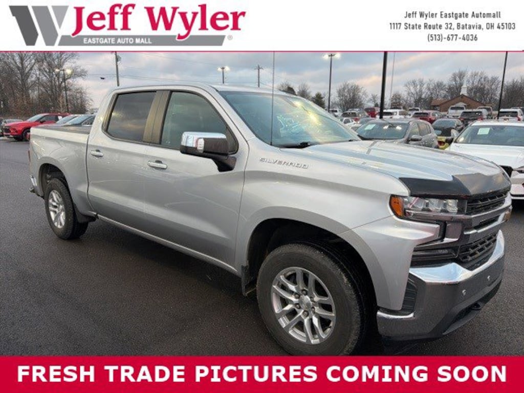 Jeff Wyler Eastgate Auto Mall is excited to offer this great-looking 2019 Chevrolet Silverado 1500 LT in Silver Ice Metallic. Well equipped with: Convenience Package (10-Way Power Driver Seat w/Lumbar, 12-Volt Rear Auxiliary Power Outlet, 40/20/40 Front Split-Bench Seat, Dual-Zone Automatic Climate Control, Electric Rear-Window Defogger, Electrical Lock Control Steering Column, EZ Lift Power Lock & Release Tailgate, Heated Driver & Front Passenger Seats, Heated Steering Wheel, Keyless Open & Start, Leather Wrapped Steering Wheel, LED Cargo Area Lighting, Manual Tilt/Telescoping Steering Column, Rear Dual USB Charging-Only Ports, Remote Vehicle Starter System, and Theft Deterrent System (Unauthorized Entry)), Preferred Equipment Group 1LT (2 USB Ports (First Row), 4-Way Manual Driver Seat Adjuster, 4.2" Diagonal Color Display Driver Info Center, Bluetooth® For Phone, Chevrolet Connected Access, Chevrolet w/4G LTE, Chrome Grille, Chrome Mirror Caps, Color-Keyed Carpeting Floor Covering, Compass, Deep-Tinted Glass, Electronic Cruise Control, Front Frame-Mounted Black Recovery Hooks, Front Rubberized Vinyl Floor Mats, Locking Tailgate, Manual Tilt Wheel Steering Column, OnStar & Chevrolet Connected Services Capable, Power Door Locks, Power Front Windows w/Driver Express Up/Down, Power Front Windows w/Passenger Express Down, Power Rear Windows w/Express Down, Rear 60/40 Folding Bench Seat (Folds Up), Rear Rubberized-Vinyl Floor Mats, Rear Vision Camera, Remote Keyless Entry, Single-Zone Manual/Semi-Automatic Air Conditioning, Steering Wheel Audio Controls, and Urethane Steering Wheel), Safety Package (Lane Change Alert w/Side Blind Zone Alert, Perimeter Lighting, Rear Cross Traffic Alert, and Ultrasonic Front & Rear Park Assist), 170 Amp Alternator, 220 Amps Alternator, 3.23 Rear Axle Ratio, 4-Wheel Disc Brakes, 4" Chromed Round Assist Steps (LPO), 40/20/40 Front Split Bench Seat, 6 Speakers, ABS brakes, Air Conditioning, Alloy wheels, AM/FM radio, Apple CarPlay/Android Auto, Auxiliary External Transmission Oil Cooler, Brake assist, Bumpers: chrome, Cloth Seat Trim, Delay-off headlights, Driver door bin, Driver vanity mirror, Dual front impact airbags, Dual front side impact airbags, Electronic Stability Control, External Engine Oil Cooler, Front anti-roll bar, Front Center Armrest w/Storage, Front License Plate Kit, Front reading lights, Front wheel independent suspension, Fully automatic headlights, Heated door mirrors, Heavy Duty Suspension, Heavy-Duty Rear Locking Differential, Illuminated entry, Low tire pressure warning, Occupant sensing airbag, Outside temperature display, Overhead airbag, Overhead console, Panic alarm, Passenger door bin, Passenger vanity mirror, Power door mirrors, Power steering, Power windows, Premium audio system: Chevrolet Infotainment System 3, Radio data system, Radio: Chevrolet Infotainment 3 System, Rear reading lights, Rear step bumper, Remote keyless entry, Speed control, Speed-sensing steering, Split folding rear seat, Steering wheel mounted audio controls, Tachometer, Tilt steering wheel, Traction control, Trip computer, Variably intermittent wipers, Voltmeter, Wheels: 17" x 8" Bright Silver Painted Aluminum, and Wheels: 18" x 8.5" Bright Silver Painted Aluminum. Clean CARFAX. Ask about available certifications. Used vehicles 10 years of age or newer with less than 100,000 miles are eligible for the Wyler Assurance Program, but eligible vehicles must pass our reconditioning process and multi-point inspection. Provided the vehicle passes inspection, vehicles will be eligible for the 6 month/6,000 mile limited warranty. The 6 month/6,000 mile limited warranty is NOT available on AS-IS vehicles, wholesale vehicles, lease buyback/pass-thru vehicles or un-inspected vehicles. Note that this program can also apply to vehicles where the remaining factory coverage is less than 6 months or 6,000 miles. Please check the Federal Trade Commission (FTC) Buyers guide on the vehicle for full details as to whe