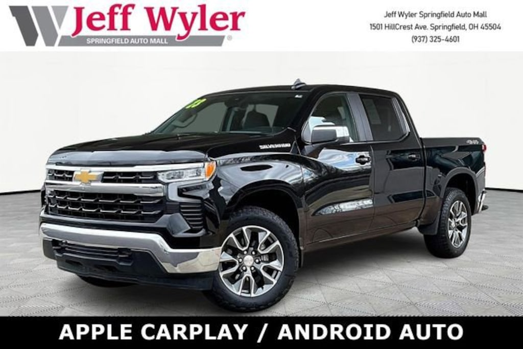 Jeff Wyler Springfield Auto Mall is excited to offer this attractive-looking 2023 Chevrolet Silverado 1500 LT in Black. Well equipped with: Convenience Package (10-Way Power Driver Seat w/Lumbar, 120-Volt Bed Mounted Power Outlet, 120-Volt Instrument Panel Power Outlet, Dual Rear USB Ports (Charge Only), Dual-Zone Automatic Climate Control, Heated Driver & Front Outboard Passenger Seats, Heated Steering Wheel, Keyless Open & Start, and Wrapped Steering Wheel), High Capacity Suspension Package, Standard Suspension Package, Trailering Package (Hitch Guidance), 12.3 Multicolor Reconfigurable Digital Display, 3.42 Rear Axle Ratio, 4-Wheel Disc Brakes, 40/20/40 Front Split-Bench Seat, 6 Speakers, 6-Speaker Audio System, ABS brakes, Air Conditioning, All-Star Edition, Alloy wheels, AM/FM radio: SiriusXM with 360L, Apple CarPlay/Android Auto, Auto High-beam Headlights, Auto-Locking Rear Differential, Automatic Emergency Braking, Automatic temperature control, Bluetooth® For Phone, Brake assist, Bumpers: chrome, Chevrolet Connected Access Capable, Chrome Mirror Caps, Cloth Seat Trim, Color-Keyed Carpeting Floor Covering, Compass, Deep-Tinted Glass, Delay-off headlights, Driver door bin, Driver vanity mirror, Dual front impact airbags, Dual front side impact airbags, Electric Rear-Window Defogger, Electrical Steering Column Lock, Electronic Cruise Control, Electronic Stability Control, Following Distance Indicator, Forward Collision Alert, Front anti-roll bar, Front Center Armrest w/Storage, Front dual zone A/C, Front Frame-Mounted Black Recovery Hooks, Front Pedestrian Braking, Front reading lights, Front wheel independent suspension, Fully automatic headlights, HD Rear Vision Camera, Heated door mirrors, Heated front seats, Heated steering wheel, Illuminated entry, IntelliBeam Automatic High Beam On/Off, Lane Keep Assist w/Lane Departure Warning, LED Cargo Area Lighting, Low tire pressure warning, Not Equipped w/Steering Column Lock, Occupant sensing airbag, OnStar & Chevrolet Connected Services Capable, Outside temperature display, Overhead airbag, Overhead console, Panic alarm, Passenger door bin, Passenger vanity mirror, Power door mirrors, Power driver seat, Power Front Windows w/Driver Express Up/Down, Power Front Windows w/Passenger Express Down, Power Rear Windows w/Express Down, Power steering, Power windows, Premium audio system: Chevrolet Infotainment 3 Premium, Radio data system, Radio: Chevrolet Infotainment 3 Premium System, Rear 60/40 Folding Bench Seat (Folds Up), Rear reading lights, Rear step bumper, Rear window defroster, Remote keyless entry, Remote Vehicle Starter System, Security system, SiriusXM w/360L, Speed control, Speed-sensing steering, Split folding rear seat, Steering Wheel Audio Controls, Steering wheel mounted audio controls, Tachometer, Telescoping steering wheel, Theft Deterrent System (Unauthorized Entry), Tilt steering wheel, Traction control, Trip computer, Variably intermittent wipers, Voltmeter, Wheels: 18 x 8.5 Bright Silver Painted Aluminum, Wheels: 20 x 9 Painted Aluminum, Wi-Fi Hot Spot Capable, and Wireless Phone Projection. Ask about available certifications. Used vehicles 10 years of age or newer with less than 100,000 miles are eligible for the Wyler Assurance Program, but eligible vehicles must pass our reconditioning process and multi-point inspection. Provided the vehicle passes inspection, vehicles will be eligible for the 6 month/6,000 mile limited warranty. The 6 month/6,000 mile limited warranty is NOT available on AS-IS vehicles, wholesale vehicles, lease buyback/pass-thru vehicles or un-inspected vehicles. Note that this program can also apply to vehicles where the remaining factory coverage is less than 6 months or 6,000 miles. Please check the Federal Trade Commission (FTC) Buyers guide on the vehicle for full details as to whether or not warranty coverage may apply. Contact Dealer for additional details. The Wyler Assurance 6 month/6,000 Mile limited warranty ends 6 mont