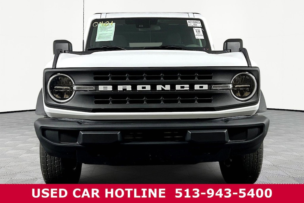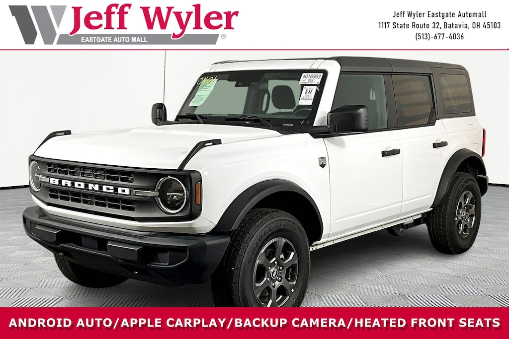 Jeff Wyler Eastgate Auto Mall is delighted to offer this terrific 2025 Ford Bronco Big Bend in Oxford White. Well equipped with: Equipment Group 222A Mid Package (2-Door Intelligent Access w/Lock/Unlock, Ambient Footwell Lighting, Connected Navigation, Dr & Pass Illuminated Sliding Visor Vanity Mirrors, Dual Smart Charging USB Ports, Dual-Zone Electronic Automatic Temperature Control, Front Row Heated Seats, Power Outlet - Back Side of Center Floor Console, and Rear Parking Sensors), 4-Wheel Disc Brakes, 4.46 Axle Ratio, 7 Speakers, ABS brakes, Air Conditioning, Alloy wheels, AM/FM radio: SiriusXM with 360L, AM/FM Stereo, Auto High-Beam Headlamps, Auto High-beam Headlights, BLIS Blind Spot Information System, Brake assist, Carbonized Gray Molded-In-Color Hard Top, Cloth Bucket Seats, Compass, Delay-off headlights, Driver door bin, Driver vanity mirror, Dual front impact airbags, Dual front side impact airbags, Electronic Stability Control, Emergency communication system: 911 Assist, Exterior Parking Camera Rear, Front anti-roll bar, Front Bucket Seats, Front Center Armrest, Front reading lights, Front wheel independent suspension, Fully automatic headlights, Heated door mirrors, Illuminated entry, Integrated roll-over protection, Internet access capable: FordPass Connect, Lane-Keeping System, Leather Shift Knob, Low tire pressure warning, Occupant sensing airbag, Outside temperature display, Overhead airbag, Overhead console, Panic alarm, Passenger door bin, Passenger vanity mirror, Power door mirrors, Power steering, Power windows, Pre-Collision Assist w/Automatic Emergency Braking, Radio data system, Rear-View Camera, Rear-Window Defroster & Washer, Remote keyless entry, Security system, SiriusXM w/360L, Speed control, Split folding rear seat, Steering wheel mounted audio controls, SYNC 4, Tachometer, Telescoping steering wheel, Tilt steering wheel, Traction control, Trip computer, Variably intermittent wipers, and Wheels: 17" Carbonized Gray-Painted Aluminum. CARFAX One-Owner. Ask about available certifications. Used vehicles 10 years of age or newer with less than 100,000 miles are eligible for the Wyler Assurance Program, but eligible vehicles must pass our reconditioning process and multi-point inspection. Provided the vehicle passes inspection, vehicles will be eligible for the 6 month/6,000 mile limited warranty. The 6 month/6,000 mile limited warranty is NOT available on AS-IS vehicles, wholesale vehicles, lease buyback/pass-thru vehicles or un-inspected vehicles. Note that this program can also apply to vehicles where the remaining factory coverage is less than 6 months or 6,000 miles. Please check the Federal Trade Commission (FTC) Buyers guide on the vehicle for full details as to whether or not warranty coverage may apply. Contact Dealer for additional details. The Wyler Assurance 6 month/6,000 Mile limited warranty ends 6 months from the date of the Retail Purchase Agreement (BUYERS ORDER) or when the vehicle's odometer registers 6,000 additional miles to the mileage listed on the BUYERS ORDER, whichever comes first. Your Deductible - The warranty holder on your contract pays the first $100 of each covered repair.