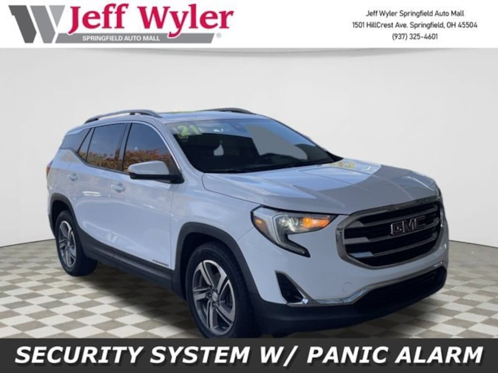 Jeff Wyler Springfield Auto Mall is honored to offer this attractive-looking 2021 GMC Terrain SLT in Summit White. Well equipped with: Preferred Equipment Group 4SA, 2 USB Data Ports, 2 USB Data Ports w/SD Card Reader, 3.47 Axle Ratio, 4-Wheel Disc Brakes, 6 Speakers, 6-Speaker Audio System Feature, 8-Way Power Driver Seat Adjuster, ABS brakes, Air Conditioning, Alloy wheels, AM/FM radio: SiriusXM, Apple CarPlay/Android Auto, Auto High-beam Headlights, Auto-dimming door mirrors, Auto-dimming Rear-View mirror, Automatic temperature control, Bluetooth® For Phone, Brake assist, Bumpers: body-color, Compass, Delay-off headlights, Driver & Front Passenger Heated Seats, Driver door bin, Driver vanity mirror, Dual front impact airbags, Dual front side impact airbags, Electronic Stability Control, Emergency communication system: OnStar and GMC connected services capable, Exterior Parking Camera Rear, Four wheel independent suspension, Front anti-roll bar, Front Bucket Seats, Front Center Armrest, Front dual zone A/C, Front fog lights, Front reading lights, Fully automatic headlights, Garage door transmitter, Heated door mirrors, Heated front seats, Heated steering wheel, High-Intensity Discharge Headlights, Illuminated entry, Low tire pressure warning, Memory seat, Occupant sensing airbag, Outside temperature display, Overhead airbag, Overhead console, Panic alarm, Passenger door bin, Passenger vanity mirror, Perforated Leather-Appointed Seat Trim, Power door mirrors, Power Driver Lumbar Control, Power driver seat, Power Liftgate, Power passenger seat, Power steering, Power windows, Radio data system, Radio: GMC Infotainment Audio System w/8 Display, Rear anti-roll bar, Rear seat center armrest, Rear window defroster, Rear window wiper, Remote keyless entry, Roof rack: rails only, Security system, SiriusXM Radio, Speed control, Speed-sensing steering, Split folding rear seat, Spoiler, Steering wheel mounted audio controls, Tachometer, Telescoping steering wheel, Tilt steering wheel, Traction control, Trip computer, Turn signal indicator mirrors, Variably intermittent wipers, and Wheels: 18 x 7 Machined Aluminum w/Gray Accents. Ask about available certifications. Used vehicles 10 years of age or newer with less than 100,000 miles are eligible for the Wyler Assurance Program, but eligible vehicles must pass our reconditioning process and multi-point inspection. Provided the vehicle passes inspection, vehicles will be eligible for the 6 month/6,000 mile limited warranty. The 6 month/6,000 mile limited warranty is NOT available on AS-IS vehicles, wholesale vehicles, lease buyback/pass-thru vehicles or un-inspected vehicles. Note that this program can also apply to vehicles where the remaining factory coverage is less than 6 months or 6,000 miles. Please check the Federal Trade Commission (FTC) Buyers guide on the vehicle for full details as to whether or not warranty coverage may apply. Contact Dealer for additional details. The Wyler Assurance 6 month/6,000 Mile limited warranty ends 6 months from the date of the Retail Purchase Agreement (BUYERS ORDER) or when the vehicle's odometer registers 6,000 additional miles to the mileage listed on the BUYERS ORDER, whichever comes first. Your Deductible - The warranty holder on your contract pays the first $100 of each covered repair.