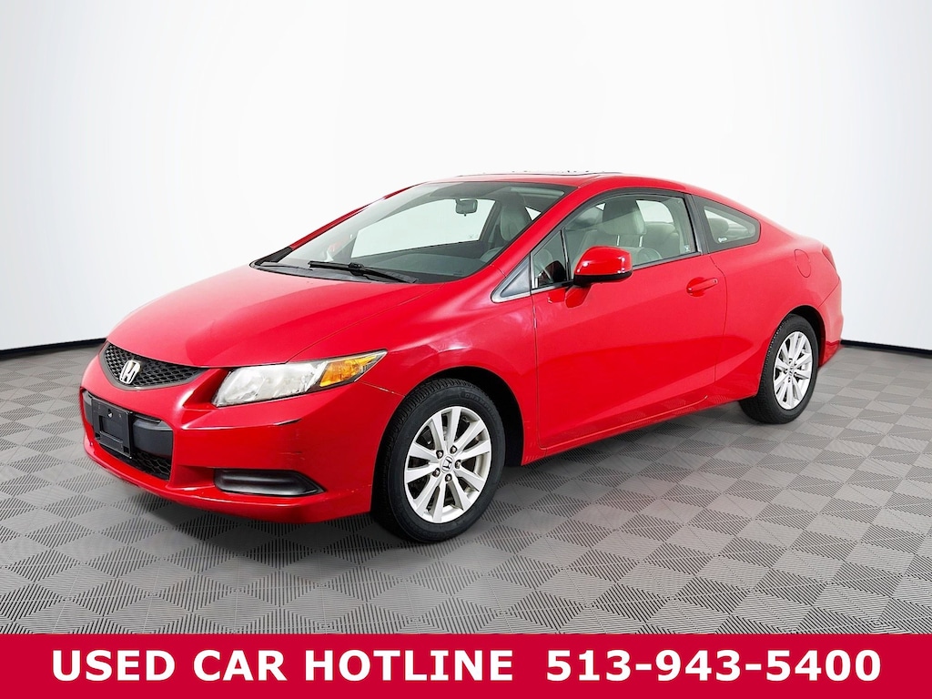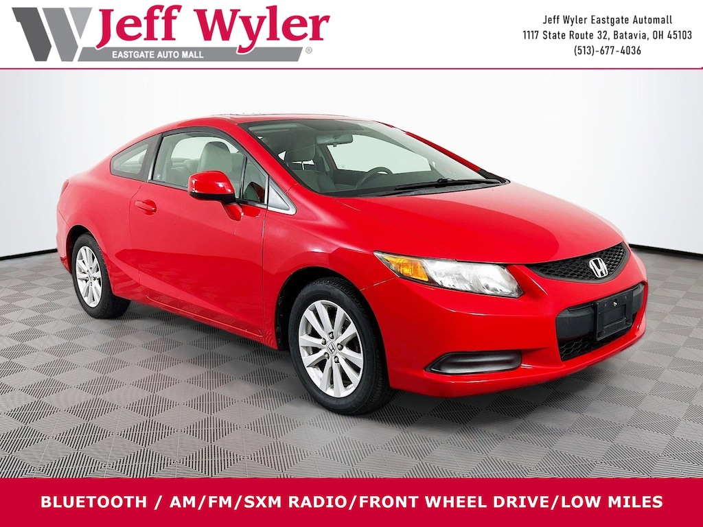 Jeff Wyler Eastgate Auto Mall is pumped up to offer this good-looking 2012 Honda Civic EX in Red. Well equipped with: 4-Wheel Disc Brakes, 7 Speakers, ABS brakes, Air Conditioning, Alloy wheels, Brake assist, Bumpers: body-color, CD player, Cloth Seat Trim, Delay-off headlights, Driver door bin, Driver vanity mirror, Dual front impact airbags, Dual front side impact airbags, Electronic Stability Control, Four wheel independent suspension, Front anti-roll bar, Front Bucket Seats, Front Center Armrest, Front reading lights, Illuminated entry, Low tire pressure warning, Occupant sensing airbag, Outside temperature display, Overhead airbag, Panic alarm, Passenger door bin, Passenger vanity mirror, Power door mirrors, Power moonroof, Power steering, Power windows, Radio data system, Rear anti-roll bar, Rear window defroster, Reclining Front Bucket Seats, Remote keyless entry, Security system, Speed control, Speed-sensing steering, Split folding rear seat, Steering wheel mounted audio controls, Tachometer, Telescoping steering wheel, Tilt steering wheel, Traction control, Trip computer, and Variably intermittent wipers. Clean CARFAX. Reviews: * * Engine choices include hybrid and natural gas versions * Excellent fuel economy * Relatively spacious for a compact sedan or coupe * Well-tuned suspension offering comfort with control Source: KBB.comAwards: * 2012 KBB.com Brand Image AwardsKelley Blue Book Brand Image Awards are based on the Brand Watch(tm) study from Kelley Blue Book Market Intelligence. Award calculated among non-luxury shoppers. For more information, visit www.kbb.com. Kelley Blue Book is a registered trademark of Kelley Blue Book Co., Inc. Ask about available certifications. Used vehicles 10 years of age or newer with less than 100,000 miles are eligible for the Wyler Assurance Program, but eligible vehicles must pass our reconditioning process and multi-point inspection. Provided the vehicle passes inspection, vehicles will be eligible for the 6 month/6,000 mile limited warranty. The 6 month/6,000 mile limited warranty is NOT available on AS-IS vehicles, wholesale vehicles, lease buyback/pass-thru vehicles or un-inspected vehicles. Note that this program can also apply to vehicles where the remaining factory coverage is less than 6 months or 6,000 miles. Please check the Federal Trade Commission (FTC) Buyers guide on the vehicle for full details as to whether or not warranty coverage may apply. Contact Dealer for additional details. The Wyler Assurance 6 month/6,000 Mile limited warranty ends 6 months from the date of the Retail Purchase Agreement (BUYERS ORDER) or when the vehicle's odometer registers 6,000 additional miles to the mileage listed on the BUYERS ORDER, whichever comes first. Your Deductible - The warranty holder on your contract pays the first $100 of each covered repair.