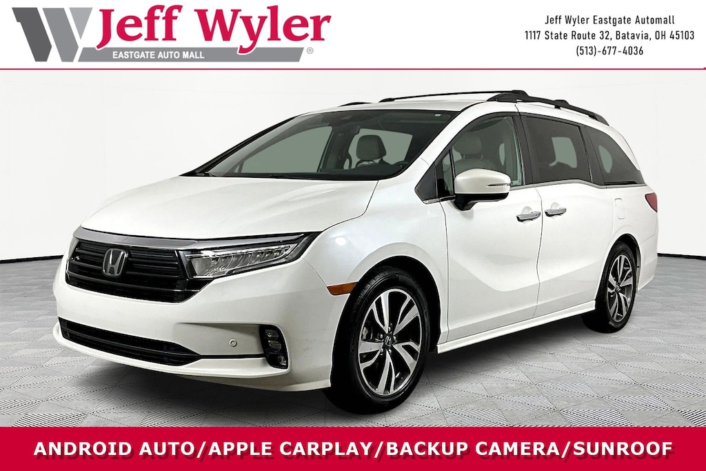 Jeff Wyler Eastgate Auto Mall is delighted to offer this good-looking 2021 Honda Odyssey Touring in White. Well equipped with: 3.61 Axle Ratio, 3rd row seats: split-bench, 4-Wheel Disc Brakes, 7 Speakers, A/V remote: CabinControl, ABS brakes, Adaptive Cruise Control: Adaptive Cruise Control (ACC) with Low-Speed Follow, Air Conditioning, Alloy wheels, AM/FM radio: SiriusXM, Anti-whiplash front head restraints, Apple CarPlay/Android Auto, Auto High-beam Headlights, Auto-dimming Rear-View mirror, Automatic temperature control, Blind Spot Information (BSI) System warning, Brake assist, Bumpers: body-color, CD player, Compass, Delay-off headlights, Driver door bin, Driver vanity mirror, Driver's Seat Mounted Armrest, Dual front impact airbags, Dual front side impact airbags, DVD-Audio, Electronic Stability Control, Emergency communication system: HondaLink, Exterior Parking Camera Rear, Forward collision: Collision Mitigation Braking System (CMBS) + FCW mitigation, Four wheel independent suspension, Front anti-roll bar, Front Bucket Seats, Front dual zone A/C, Front fog lights, Front reading lights, Fully automatic headlights, Garage door transmitter: HomeLink, Headphones, Heated door mirrors, Heated Front Bucket Seats, Heated front seats, Illuminated entry, Knee airbag, Lane departure: Lane Keeping Assist System (LKAS) active, Leather Seat Trim, Leather steering wheel, Low tire pressure warning, Memory seat, Navigation system: Honda Satellite-Linked Navigation System, Occupant sensing airbag, Outside temperature display, Overhead airbag, Overhead console, Panic alarm, Passenger door bin, Passenger seat mounted armrest, Passenger vanity mirror, Power door mirrors, Power driver seat, Power Liftgate, Power moonroof, Power passenger seat, Power steering, Power windows, Radio data system, Radio: 160-Watt AM/FM/HD/SiriusXM Audio System, Rear air conditioning, Rear anti-roll bar, Rear audio controls, Rear reading lights, Rear seat center armrest, Rear window defroster, Rear window wiper, Reclining 3rd row seat, Remote keyless entry, Security system, Speed control, Speed-sensing steering, Speed-Sensitive Wipers, Split folding rear seat, Spoiler, Steering wheel mounted audio controls, Tachometer, Telescoping steering wheel, Tilt steering wheel, Traction control, Trip computer, Turn signal indicator mirrors, Variably intermittent wipers, and Wheels: 19" Machine-Finished Alloy. Awards: * ALG Residual Value Awards, Residual Value Awards Ask about available certifications. Used vehicles 10 years of age or newer with less than 100,000 miles are eligible for the Wyler Assurance Program, but eligible vehicles must pass our reconditioning process and multi-point inspection. Provided the vehicle passes inspection, vehicles will be eligible for the 6 month/6,000 mile limited warranty. The 6 month/6,000 mile limited warranty is NOT available on AS-IS vehicles, wholesale vehicles, lease buyback/pass-thru vehicles or un-inspected vehicles. Note that this program can also apply to vehicles where the remaining factory coverage is less than 6 months or 6,000 miles. Please check the Federal Trade Commission (FTC) Buyers guide on the vehicle for full details as to whether or not warranty coverage may apply. Contact Dealer for additional details. The Wyler Assurance 6 month/6,000 Mile limited warranty ends 6 months from the date of the Retail Purchase Agreement (BUYERS ORDER) or when the vehicle's odometer registers 6,000 additional miles to the mileage listed on the BUYERS ORDER, whichever comes first. Your Deductible - The warranty holder on your contract pays the first $100 of each covered repair.
