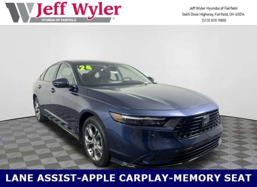 CARFAX One-Owner. Jeff Wyler Hyundai of Fairfield is proud to offer this great 2024 Honda Accord Hybrid EX-L in Canyon River Blue Metallic. Well equipped with: 2.0L 16V DOHC, Android Auto, Apple CarPlay, CALL NOW FOR YOUR VIP APPOINTMENT 513-870-9800, FULLY SERVICED w/RECORDS, GUARANTEED FINANCING!! NO MATTER YOUR SITUATION WE CAN GET AN APPROVAL!!, THE #1 Volume dealer in the region! Come see why for yourself Today!!, WE PAY MORE FOR YOUR TRADE!!, 4-Wheel Disc Brakes, 8 Speakers, ABS brakes, Adaptive Cruise Control: Adaptive Cruise Control (ACC) with Low-Speed Follow, Air Conditioning, Alloy wheels, AM/FM radio, Apple CarPlay/Android Auto, Auto High-beam Headlights, Auto-dimming Rear-View mirror, Automatic temperature control, Blind Spot Information (BSI) System warning, Brake assist, Bumpers: body-color, Compass, Delay-off headlights, Driver door bin, Driver vanity mirror, Dual front impact airbags, Dual front side impact airbags, Electronic Stability Control, Emergency communication system: HondaLink, Exterior Parking Camera Rear, Four wheel independent suspension, Front anti-roll bar, Front Bucket Seats, Front Center Armrest, Front dual zone A/C, Front reading lights, Fully automatic headlights, Heated door mirrors, Heated Front Bucket Seats, Heated front seats, Illuminated entry, Knee airbag, Lane departure: Lane Keeping Assist System (LKAS) active, Leather Shift Knob, Leather steering wheel, Leather-Trimmed Seat Trim, Low tire pressure warning, Memory seat, Occupant sensing airbag, Outside temperature display, Overhead airbag, Overhead console, Panic alarm, Passenger door bin, Passenger vanity mirror, Power door mirrors, Power driver seat, Power moonroof, Power passenger seat, Power steering, Power windows, Radio data system, Radio: 180-Watt Audio System, Rear anti-roll bar, Rear reading lights, Rear seat center armrest, Rear side impact airbag, Rear window defroster, Remote keyless entry, Security system, Speed control, Speed-sensing steering, Speed-Sensitive Wipers, Split folding rear seat, Steering wheel mounted audio controls, Telescoping steering wheel, Tilt steering wheel, Traction control, Trip computer, Turn signal indicator mirrors, Variably intermittent wipers, and Wheels: 17" x 7.5J Pewter Gray. TO CHECK ON THE AVAILABILITY OF THIS VEHICLE REACH OUT TO ONE OF OUR TEAM MEMBERS!! ALSO SHOP ONLINE AT https://www.jeffwylerhyundaioffairfield.com/ Proudly Serving: Cincinnati, Dayton, Columbus, Louisville, Lexington, Indianapolis, Hamilton, Florence, Alexandria, Beavercreek, Springdale, West Chester, Monroe, Fairfield, Kenwood, Newport and all of greater Cincinnati Ohio, Indiana, and Northern Kentucky.