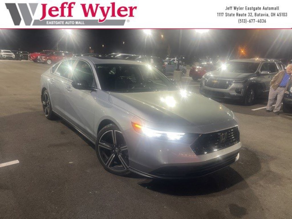 Jeff Wyler Eastgate Auto Mall is proud to offer this charming 2025 Honda Accord Hybrid Sport in . Well equipped with: 4-Wheel Disc Brakes, 8 Speakers, ABS brakes, Adaptive Cruise Control: Adaptive Cruise Control (ACC) with Low-Speed Follow, Air Conditioning, Alloy wheels, AM/FM radio, Apple CarPlay/Android Auto, Auto High-beam Headlights, Automatic temperature control, Blind Spot Information (BSI) System warning, Brake assist, Bumpers: body-color, Compass, Delay-off headlights, Driver door bin, Driver vanity mirror, Dual front impact airbags, Dual front side impact airbags, Electronic Stability Control, Emergency communication system: HondaLink, Exterior Parking Camera Rear, Fabric Seat Trim, Four wheel independent suspension, Front anti-roll bar, Front Bucket Seats, Front Center Armrest, Front dual zone A/C, Front reading lights, Fully automatic headlights, Heated Front Bucket Seats, Heated front seats, Illuminated entry, Knee airbag, Lane departure: Lane Keeping Assist System (LKAS) active, Leather Shift Knob, Leather steering wheel, Low tire pressure warning, Occupant sensing airbag, Outside temperature display, Overhead airbag, Overhead console, Panic alarm, Passenger door bin, Passenger vanity mirror, Power door mirrors, Power driver seat, Power moonroof, Power steering, Power windows, Radio data system, Radio: 180-Watt Audio System, Rear anti-roll bar, Rear reading lights, Rear seat center armrest, Rear side impact airbag, Rear window defroster, Remote keyless entry, Security system, Speed control, Speed-sensing steering, Speed-Sensitive Wipers, Split folding rear seat, Spoiler, Steering wheel mounted audio controls, Telescoping steering wheel, Tilt steering wheel, Traction control, Trip computer, Variably intermittent wipers, and Wheels: 19" x 8.5J Berlina Black. Clean CARFAX. Ask about available certifications. Used vehicles 10 years of age or newer with less than 100,000 miles are eligible for the Wyler Assurance Program, but eligible vehicles must pass our reconditioning process and multi-point inspection. Provided the vehicle passes inspection, vehicles will be eligible for the 6 month/6,000 mile limited warranty. The 6 month/6,000 mile limited warranty is NOT available on AS-IS vehicles, wholesale vehicles, lease buyback/pass-thru vehicles or un-inspected vehicles. Note that this program can also apply to vehicles where the remaining factory coverage is less than 6 months or 6,000 miles. Please check the Federal Trade Commission (FTC) Buyers guide on the vehicle for full details as to whether or not warranty coverage may apply. Contact Dealer for additional details. The Wyler Assurance 6 month/6,000 Mile limited warranty ends 6 months from the date of the Retail Purchase Agreement (BUYERS ORDER) or when the vehicle's odometer registers 6,000 additional miles to the mileage listed on the BUYERS ORDER, whichever comes first. Your Deductible - The warranty holder on your contract pays the first $100 of each covered repair.