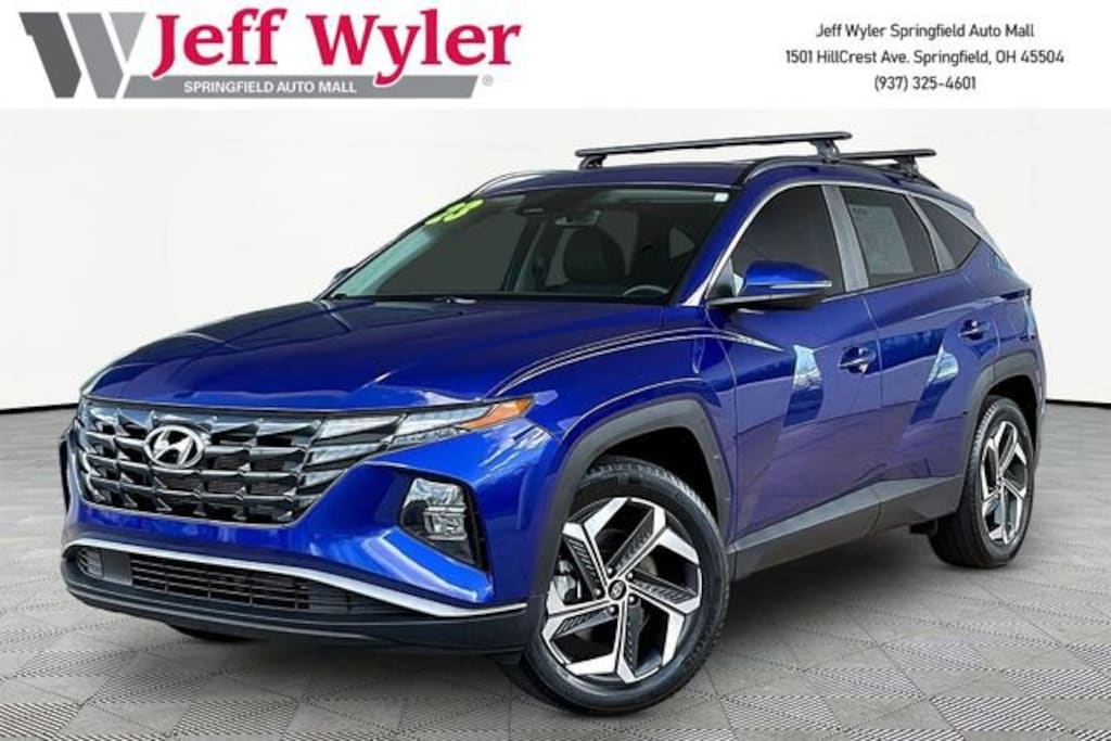Jeff Wyler Springfield Auto Mall is very proud to offer this wonderful 2023 Hyundai Tucson SEL in Intense Blue. Well equipped with: Convenience Package (10.25 Digital Instrument Cluster, Auto-Dimming Interior Mirror w/Homelink, Dual Automatic Temperature Control, H-Tex Seat Trim, Leather-Wrapped Shift Knob, Leather-Wrapped Steering Wheel, LED Interior Lights (Room, Map), Option Group 02, Power Sunroof, Ultrasonic Rear Occupant Alert, and Wheels: 19 x 7.5J Machine-Face Finish Alloy), 3.648 Axle Ratio, 4-Wheel Disc Brakes, 6 Speakers, ABS brakes, Air Conditioning, Alloy wheels, AM/FM radio: SiriusXM, Apple CarPlay & Android Auto, Auto High-beam Headlights, Brake assist, Bumpers: body-color, Cargo Net, Carpeted Floor Mats, Delay-off headlights, Driver door bin, Driver vanity mirror, Dual front impact airbags, Dual front side impact airbags, Electronic Stability Control, Emergency communication system: Blue Link Connected Car Service (3-year complimentary subscription), First Aid Kit, Four wheel independent suspension, Front anti-roll bar, Front Bucket Seats, Front Center Armrest, Front reading lights, Fully automatic headlights, Heated door mirrors, Heated Front Bucket Seats, Heated front seats, Illuminated entry, Low tire pressure warning, Occupant sensing airbag, Outside temperature display, Overhead airbag, Overhead console, Panic alarm, Passenger door bin, Passenger vanity mirror, Power door mirrors, Power driver seat, Power Liftgate, Power steering, Power windows, Radio data system, Radio: AM/FM/HD/SiriusXM Audio System, Rear anti-roll bar, Rear seat center armrest, Rear window defroster, Rear window wiper, Remote keyless entry, Roof Rack Cross Rails (DISC), Roof rack: rails only, Security system, Speed control, Split folding rear seat, Spoiler, Stain & Odor Resistant Cloth Seat Trim, Steering wheel mounted audio controls, Tachometer, Telescoping steering wheel, Tilt steering wheel, Traction control, Trip computer, Turn signal indicator mirrors, Variably intermittent wipers, and Wheels: 17 x 7.0J Alloy. Ask about available certifications. Used vehicles 10 years of age or newer with less than 100,000 miles are eligible for the Wyler Assurance Program, but eligible vehicles must pass our reconditioning process and multi-point inspection. Provided the vehicle passes inspection, vehicles will be eligible for the 6 month/6,000 mile limited warranty. The 6 month/6,000 mile limited warranty is NOT available on AS-IS vehicles, wholesale vehicles, lease buyback/pass-thru vehicles or un-inspected vehicles. Note that this program can also apply to vehicles where the remaining factory coverage is less than 6 months or 6,000 miles. Please check the Federal Trade Commission (FTC) Buyers guide on the vehicle for full details as to whether or not warranty coverage may apply. Contact Dealer for additional details. The Wyler Assurance 6 month/6,000 Mile limited warranty ends 6 months from the date of the Retail Purchase Agreement (BUYERS ORDER) or when the vehicle's odometer registers 6,000 additional miles to the mileage listed on the BUYERS ORDER, whichever comes first. Your Deductible - The warranty holder on your contract pays the first $100 of each covered repair.