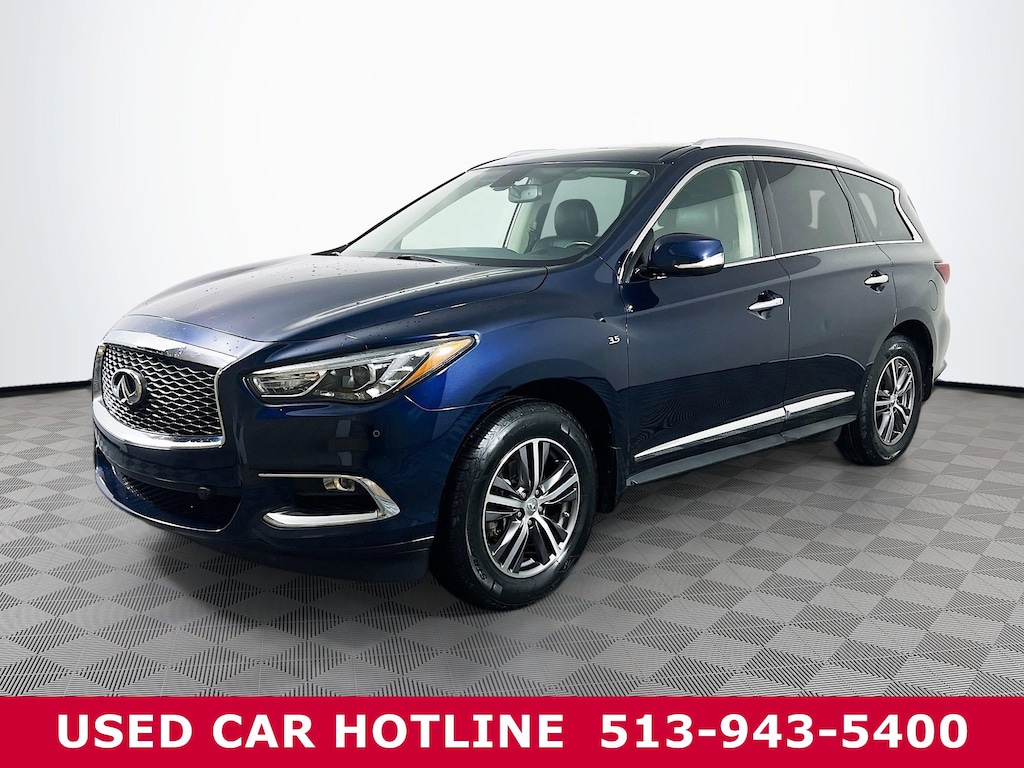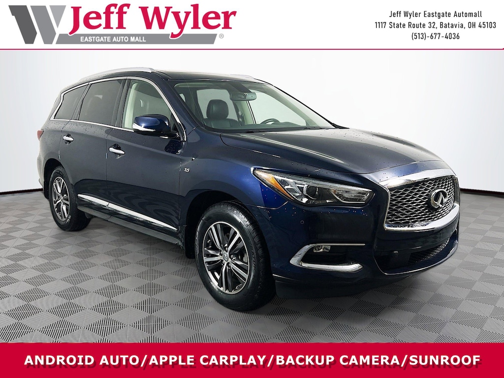 Jeff Wyler Eastgate Auto Mall is honored to offer this gorgeous 2018 INFINITI QX60 in Hermosa Blue. Well equipped with: Driver Assistance Package (Active Trace Control, Auto Side Dimming Mirrors, Back-Up Collision Intervention (BCI), Blind Spot Warning System (BSW), Distance Control Assist, ECO Pedal, Front & Rear Sonar Sensors, and Intelligent Cruise Control), Premium Package (2-Way Driver's Seat Power Lumbar Support, Dual Occupant Memory System, Enhanced Intelligent Key Memory, Entry & Exit Assist, Heated Steering Wheel, Outside Mirrors w/Reverse Tilt-Down Feature, Radio: AM/FM/CD/DVD w/MP3 Playback Capability, Rear Bumper Protector, Remote Engine Start, and Roof Rails), Premium Plus Package (Around View Monitor w/Moving Object Detection, Illuminated Kick Plates (IKP), INFINITI Navigation, Rain-Sensing Front Windshield Wipers, and Voice Recognition For Navigation), 3rd row seats: bench, 4-Wheel Disc Brakes, 5.25 Axle Ratio, 6 Speakers, ABS brakes, Air Conditioning, Alloy wheels, AM/FM radio: SiriusXM, AM/FM/CD/MP3 Audio System, Auto-dimming Rear-View mirror, Automatic temperature control, Bodyside moldings, Brake assist, Bumpers: body-color, CD player, Delay-off headlights, Driver door bin, Driver vanity mirror, Dual front impact airbags, Dual front side impact airbags, Electronic Stability Control, Four wheel independent suspension, Front anti-roll bar, Front Bucket Seats, Front Center Armrest w/Storage, Front dual zone A/C, Front fog lights, Front reading lights, Fully automatic headlights, Garage door transmitter, Heated door mirrors, Heated Front Seats, Heated front seats, High intensity discharge headlights: Bi-Xenon, Illuminated entry, Leather Shift Knob, Leather steering wheel, Leather-Appointed Seats, Low tire pressure warning, Occupant sensing airbag, Outside temperature display, Overhead airbag, Overhead console, Panic alarm, Passenger door bin, Passenger vanity mirror, Power door mirrors, Power driver seat, Power Liftgate, Power moonroof, Power passenger seat, Power steering, Power windows, Radio data system, Rear air conditioning, Rear anti-roll bar, Rear reading lights, Rear seat center armrest, Rear window defroster, Rear window wiper, Reclining 3rd row seat, Remote keyless entry, Security system, Speed control, Speed-sensing steering, Speed-Sensitive Wipers, Splash Guards (Color-Matched Set of 4), Split folding rear seat, Spoiler, Steering wheel mounted audio controls, Tachometer, Telescoping steering wheel, Tilt steering wheel, Traction control, Trip computer, Turn signal indicator mirrors, Variably intermittent wipers, and Wheels: 18" Triple 5-Spoke Aluminum-Alloy. Awards: * 2018 KBB.com 5-Year Cost to Own Awards Ask about available certifications. Used vehicles 10 years of age or newer with less than 100,000 miles are eligible for the Wyler Assurance Program, but eligible vehicles must pass our reconditioning process and multi-point inspection. Provided the vehicle passes inspection, vehicles will be eligible for the 6 month/6,000 mile limited warranty. The 6 month/6,000 mile limited warranty is NOT available on AS-IS vehicles, wholesale vehicles, lease buyback/pass-thru vehicles or un-inspected vehicles. Note that this program can also apply to vehicles where the remaining factory coverage is less than 6 months or 6,000 miles. Please check the Federal Trade Commission (FTC) Buyers guide on the vehicle for full details as to whether or not warranty coverage may apply. Contact Dealer for additional details. The Wyler Assurance 6 month/6,000 Mile limited warranty ends 6 months from the date of the Retail Purchase Agreement (BUYERS ORDER) or when the vehicle's odometer registers 6,000 additional miles to the mileage listed on the BUYERS ORDER, whichever comes first. Your Deductible - The warranty holder on your contract pays the first $100 of each covered repair.