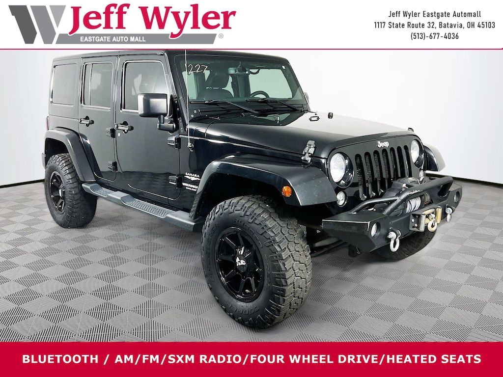 Jeff Wyler Eastgate Auto Mall is proud to offer this terrific 2015 Jeep Wrangler Unlimited Sahara in Black Clearcoat. Well equipped with: Connectivity Group (Tire Pressure Monitoring Display and Vehicle Information Center), Max Tow Package, MOPAR Premium Sound & Leather (Alpine 9-Speaker w/All Weather Subwoofer and Heated Front Seats), Quick Order Package 24G, Trailer Tow Group (Class II Receiver Hitch and Trailer Tow w/4-Pin Connector Wiring), 18" x 7.5" Polished Satin Carbon Wheels, 4-Wheel Disc Brakes, 40GB Hard Drive w/20GB Available, 5-Year SIRIUSXM Traffic Service, 5-Year SIRIUSXM Travel Link Service, 8 Speakers, ABS brakes, Air Conditioning, Air Conditioning w/Auto Temperature Control, Air Filtering, Alloy wheels, AM/FM radio, Audio Jack Input for Mobile Devices, Auto-dimming Rear-View mirror, Brake assist, CD player, Cloth Bucket Seats, Compass, Driver door bin, Driver vanity mirror, Dual front impact airbags, Electronic Stability Control, Front anti-roll bar, Front Bucket Seats, Front Center Armrest w/Storage, Front fog lights, Front reading lights, Fully automatic headlights, Heated door mirrors, Heavy Duty Suspension w/Gas Shocks, Humidity Sensor, Illuminated entry, Integrated roll-over protection, Integrated Voice Command w/Bluetooth, Leather steering wheel, Leather Wrapped Steering Wheel, Low tire pressure warning, MOPAR Slush Mats, Occupant sensing airbag, Outside temperature display, Panic alarm, Passenger door bin, Passenger vanity mirror, Power door mirrors, Power steering, Power windows, Radio data system, Radio: Uconnect 130 AM/FM/CD/MP3, Radio: Uconnect 730N CD/DVD/MP3/HDD/NAV, Rear anti-roll bar, Remote keyless entry, Remote Start System, Remote USB Port, Security system, SIRIUSXM Traffic, SIRIUSXM Travel Link, Speed control, Split folding rear seat, Steering wheel mounted audio controls, Tachometer, Tilt steering wheel, Traction control, Trip computer, Uconnect Voice Command w/Bluetooth, and Variably intermittent wipers. CARFAX One-Owner. Clean CARFAX. Ask about available certifications. Used vehicles 10 years of age or newer with less than 100,000 miles are eligible for the Wyler Assurance Program, but eligible vehicles must pass our reconditioning process and multi-point inspection. Provided the vehicle passes inspection, vehicles will be eligible for the 6 month/6,000 mile limited warranty. The 6 month/6,000 mile limited warranty is NOT available on AS-IS vehicles, wholesale vehicles, lease buyback/pass-thru vehicles or un-inspected vehicles. Note that this program can also apply to vehicles where the remaining factory coverage is less than 6 months or 6,000 miles. Please check the Federal Trade Commission (FTC) Buyers guide on the vehicle for full details as to whether or not warranty coverage may apply. Contact Dealer for additional details. The Wyler Assurance 6 month/6,000 Mile limited warranty ends 6 months from the date of the Retail Purchase Agreement (BUYERS ORDER) or when the vehicle's odometer registers 6,000 additional miles to the mileage listed on the BUYERS ORDER, whichever comes first. Your Deductible - The warranty holder on your contract pays the first $100 of each covered repair.