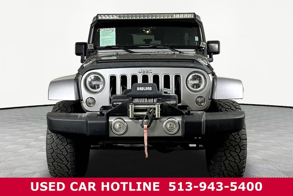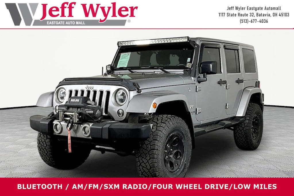 Jeff Wyler Eastgate Auto Mall is proud to offer this wonderful-looking 2016 Jeep Wrangler Unlimited Sahara in Billet Silver Metallic Clearcoat. Well equipped with: Connectivity Group (Leather Wrapped Steering Wheel, Remote USB Port, Tire Pressure Monitoring Display, Uconnect Voice Command w/Bluetooth, and Vehicle Information Center), MOPAR Premium Sound & Leather (Alpine 9-Speaker w/All Weather Subwoofer and Heated Front Seats), Quick Order Package 24G (Body Color Appliques Front Bumper, Body Color Appliques Rear Bumper, and Body Color/Accent Color Grille), 18" x 7.5" Polished Satin Carbon Wheels, 3.21 Rear Axle Ratio, 4-Wheel Disc Brakes, 8 Speakers, ABS brakes, Air Conditioning, Alloy wheels, AM/FM radio: SiriusXM, Audio Jack Input for Mobile Devices, Auto-dimming Rear-View mirror, Brake assist, CD player, Cloth Seats w/Adjustable Head Restraints, Compass, Driver door bin, Driver vanity mirror, Dual front impact airbags, Electronic Stability Control, Freedom Panel Storage Bag, Front anti-roll bar, Front Bucket Seats, Front Center Armrest w/Storage, Front fog lights, Front reading lights, Fully automatic headlights, Heated door mirrors, Heavy Duty Suspension w/Gas Shocks, Illuminated entry, Integrated roll-over protection, Leather steering wheel, Low tire pressure warning, MOPAR Slush Mats, Occupant sensing airbag, Outside temperature display, Panic alarm, Passenger door bin, Passenger vanity mirror, Power door mirrors, Power steering, Power windows, Radio data system, Radio: 130, Rear anti-roll bar, Rear Window Defroster, Rear Window Wiper/Washer, Remote keyless entry, Remote Start System, Security system, Speed control, Split folding rear seat, Steering wheel mounted audio controls, Tachometer, Tilt steering wheel, Traction control, Trip computer, Tubular Side Steps (DISC), and Variably intermittent wipers. Clean CARFAX. Ask about available certifications. Used vehicles 10 years of age or newer with less than 100,000 miles are eligible for the Wyler Assurance Program, but eligible vehicles must pass our reconditioning process and multi-point inspection. Provided the vehicle passes inspection, vehicles will be eligible for the 6 month/6,000 mile limited warranty. The 6 month/6,000 mile limited warranty is NOT available on AS-IS vehicles, wholesale vehicles, lease buyback/pass-thru vehicles or un-inspected vehicles. Note that this program can also apply to vehicles where the remaining factory coverage is less than 6 months or 6,000 miles. Please check the Federal Trade Commission (FTC) Buyers guide on the vehicle for full details as to whether or not warranty coverage may apply. Contact Dealer for additional details. The Wyler Assurance 6 month/6,000 Mile limited warranty ends 6 months from the date of the Retail Purchase Agreement (BUYERS ORDER) or when the vehicle's odometer registers 6,000 additional miles to the mileage listed on the BUYERS ORDER, whichever comes first. Your Deductible - The warranty holder on your contract pays the first $100 of each covered repair.
