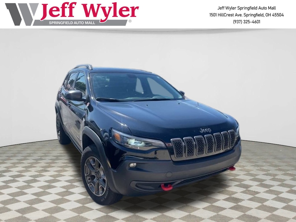 Jeff Wyler Springfield Auto Mall is excited to offer this fantastic-looking 2020 Jeep Cherokee Trailhawk in Diamond Black Crystal Pearlcoat. Well equipped with: Cold Weather Group (Engine Block Heater, Heated Front Seats, Heated Steering Wheel, Leather Wrapped Steering Wheel, and Windshield Wiper De-Icer), Quick Order Package 2ZE Trailhawk, 4-Wheel Disc Brakes, 6 Speakers, 8.4" Touchscreen Display, ABS brakes, Air Conditioning, Alloy wheels, AM/FM radio: SiriusXM, Anti-whiplash front head restraints, Apple CarPlay, Apple CarPlay/Android Auto, Automatic temperature control, AutoStick Automatic Transmission, Auxiliary Transmission Oil Cooler, Brake assist, Cloth/Premium Vinyl Bucket Seats, Compass, Delay-off headlights, Driver door bin, Driver vanity mirror, Dual Bright Exhaust Tips, Dual front impact airbags, Dual front side impact airbags, Electronic Stability Control, Engine Oil Cooler, Exterior Mirrors Courtesy Lamps, Exterior Mirrors w/Supplemental Signals, Four wheel independent suspension, Front anti-roll bar, Front Bucket Seats, Front Center Armrest, Front dual zone A/C, Front fog lights, Front reading lights, Fully automatic headlights, Google Android Auto, GPS Antenna Input, Heated door mirrors, Hill Descent Control, Illuminated entry, Integrated Voice Command w/Bluetooth, Knee airbag, Leather Shift Knob, Low tire pressure warning, Occupant sensing airbag, Off Road Suspension, Outside temperature display, Overhead airbag, Overhead console, Panic alarm, ParkView Rear Back-Up Camera, Passenger door bin, Passenger vanity mirror, Power door mirrors, Power driver seat, Power steering, Power windows, Radio data system, Radio: Uconnect 4 w/8.4" Display, Rear anti-roll bar, Rear reading lights, Rear seat center armrest, Rear side impact airbag, Rear window defroster, Rear window wiper, Remote keyless entry, Roof rack: rails only, SiriusXM Satellite Radio, Speed control, Speed-sensing steering, Split folding rear seat, Spoiler, Steering wheel mounted audio controls, Stop-Start Multiple VSM System, Tachometer, Telescoping steering wheel, Tilt steering wheel, Traction control, Trip computer, Turn signal indicator mirrors, USB Host Flip, Variably intermittent wipers, Voltmeter, and Wheels: 17" x 7.5" Painted Diamond Cut Aluminum. Ask about available certifications. Used vehicles 10 years of age or newer with less than 100,000 miles are eligible for the Wyler Assurance Program, but eligible vehicles must pass our reconditioning process and multi-point inspection. Provided the vehicle passes inspection, vehicles will be eligible for the 6 month/6,000 mile limited warranty. The 6 month/6,000 mile limited warranty is NOT available on AS-IS vehicles, wholesale vehicles, lease buyback/pass-thru vehicles or un-inspected vehicles. Note that this program can also apply to vehicles where the remaining factory coverage is less than 6 months or 6,000 miles. Please check the Federal Trade Commission (FTC) Buyers guide on the vehicle for full details as to whether or not warranty coverage may apply. Contact Dealer for additional details. The Wyler Assurance 6 month/6,000 Mile limited warranty ends 6 months from the date of the Retail Purchase Agreement (BUYERS ORDER) or when the vehicle's odometer registers 6,000 additional miles to the mileage listed on the BUYERS ORDER, whichever comes first. Your Deductible - The warranty holder on your contract pays the first $100 of each covered repair.