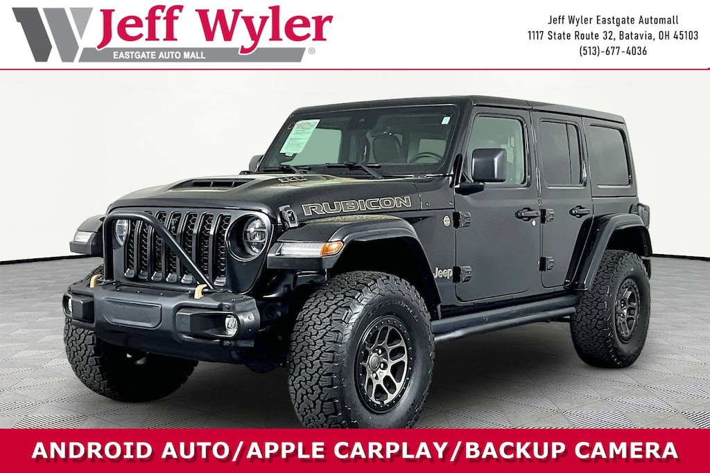 Jeff Wyler Eastgate Auto Mall is excited to offer this fantastic-looking 2022 Jeep Wrangler Unlimited Rubicon 392 in Black Clearcoat. Well equipped with: Dual Top Group (Freedom Panel Storage Bag and Premium Black Sunrider Soft Top), Quick Order Package 27X, Trail Rail Management System (Cargo Compartment Floor Mat), Trailer Tow Package (7 & 4 Pin Wiring Harness and Class II Receiver Hitch), Xtreme Recon 35" Tire Package (DISC) (35" Tire Rubicon 392 Suspension (DISC), 97 MPH Vehicle Max Speed Calibration, MOPAR Hinge-Gate Reinforcement, Wheel Flare Extensions, and Wheels: 17" x 8" Bronze Beadlock Capable (DISC)), 4-Wheel Disc Brakes, 9 Speakers, ABS brakes, Air Conditioning, Alloy wheels, AM/FM radio: SiriusXM, Apple CarPlay/Android Auto, Auto High-beam Headlights, Auto-dimming Rear-View mirror, Automatic temperature control, Brake assist, Compass, Convertible HardTop, Delay-off headlights, Driver door bin, Driver vanity mirror, Dual front impact airbags, Dual front side impact airbags, Electronic Stability Control, Emergency communication system: SiriusXM Guardian, Front anti-roll bar, Front Bucket Seats, Front Center Armrest w/Storage, Front dual zone A/C, Front fog lights, Front reading lights, Fully automatic headlights, Garage door transmitter, Glass rear window, Heated door mirrors, Heated front seats, Heated steering wheel, Illuminated entry, Integrated Off-Road Camera, Integrated roll-over protection, Leather Shift Knob, Leather steering wheel, Leather Trimmed Bucket Seats, Low tire pressure warning, MOPAR Satin Black Grille, Navigation System, Occupant sensing airbag, Outside temperature display, Panic alarm, ParkView Rear Back-Up Camera, Passenger door bin, Passenger vanity mirror, Power door mirrors, Power steering, Power windows, Radio data system, Radio: Uconnect 4C Nav w/8.4" Display, Rear anti-roll bar, Rear reading lights, Rear seat center armrest, Rear Window Defroster, Rear window defroster, Rear window wiper, Rear Window Wiper/Washer, Remote keyless entry, Rubicon 392 Suspension, Security system, Speed control, Split folding rear seat, Steering wheel mounted audio controls, Tachometer, Telescoping steering wheel, Tilt steering wheel, Traction control, Trip computer, Variably intermittent wipers, Voltmeter, and Wheels: 17" x 7.5" Beadlock Capable. CARFAX One-Owner. Ask about available certifications. Used vehicles 10 years of age or newer with less than 100,000 miles are eligible for the Wyler Assurance Program, but eligible vehicles must pass our reconditioning process and multi-point inspection. Provided the vehicle passes inspection, vehicles will be eligible for the 6 month/6,000 mile limited warranty. The 6 month/6,000 mile limited warranty is NOT available on AS-IS vehicles, wholesale vehicles, lease buyback/pass-thru vehicles or un-inspected vehicles. Note that this program can also apply to vehicles where the remaining factory coverage is less than 6 months or 6,000 miles. Please check the Federal Trade Commission (FTC) Buyers guide on the vehicle for full details as to whether or not warranty coverage may apply. Contact Dealer for additional details. The Wyler Assurance 6 month/6,000 Mile limited warranty ends 6 months from the date of the Retail Purchase Agreement (BUYERS ORDER) or when the vehicle's odometer registers 6,000 additional miles to the mileage listed on the BUYERS ORDER, whichever comes first. Your Deductible - The warranty holder on your contract pays the first $100 of each covered repair.