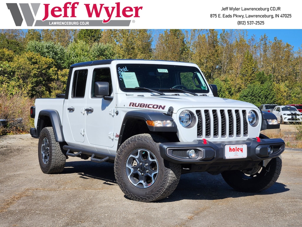Jeff Wyler Chrysler Dodge Jeep of Lawrenceburg is delighted to offer this gorgeous 2023 Jeep Gladiator Rubicon in Bright White Clearcoat. Cold Weather Group (Heated Front Seats and Heated Steering Wheel), Quick Order Package 24R Rubicon, Trailer Tow Package (240 Amp Alternator, Class IV Receiver Hitch, Heavy-Duty Engine Cooling, and Trailer Hitch Zoom), 4-Wheel Disc Brakes, 4.10 Rear Axle Ratio, 9 Speakers, 97 MPH Vehicle Max Speed Calibration, ABS brakes, Air Conditioning, Alloy wheels, AM/FM radio: SiriusXM, Apple CarPlay/Android Auto, Auto-dimming Rear-View mirror, Automatic temperature control, Black 3-Piece Hard Top, Brake assist, Compass, Delay-off headlights, Driver door bin, Driver vanity mirror, Dual front impact airbags, Dual front side impact airbags, Electronic Stability Control, Emergency communication system, Freedom Panel Storage Bag, Front anti-roll bar, Front Bucket Seats, Front Center Armrest w/Storage, Front dual zone A/C, Front fog lights, Front License Plate Bracket, Front reading lights, Fully automatic headlights, Garage door transmitter, Heated door mirrors, Illuminated entry, Integrated roll-over protection, Low tire pressure warning, MOPAR All-Weather Slush Mats, MOPAR Spray In Bedliner, Navigation System, Occupant sensing airbag, Outside temperature display, Panic alarm, ParkView Rear Back-Up Camera, Passenger door bin, Passenger vanity mirror, Performance Suspension, Power door mirrors, Power steering, Power windows, Premium Cloth Low-Back Bucket Seats, Radio data system, Radio: Uconnect 4C Nav w/8.4" Display, Rear anti-roll bar, Rear reading lights, Rear Sliding Window, Rear Window Defroster, Remote keyless entry, Security system, Speed control, Split folding rear seat, Steering wheel mounted audio controls, Tachometer, Telescoping steering wheel, Tilt steering wheel, Traction control, Trip computer, Variably intermittent wipers, Voltmeter, Wheels: 17" x 7.5" Granite Crystal Aluminum, and Wheels: 17" x 7.5" Machined/Painted Black Our PRE-OWNED vehicles are put through a rigorous 167- POINT QUALITY ASSURANCE INSPECTION along with an average amount of over $1,400.00 SPENT to recondition each vehicle so we can be sure to deliver you the highest quality vehicle like you deserve! ***ONLINE PRICE DOES NOT INCLUDE WYLER FAMILY FIRST PACKAGE*** Stop by 4136 Shelbyville Road to see for yourself, or give us a call @ 502-897-3151 to schedule your test drive! Ask about available certifications.