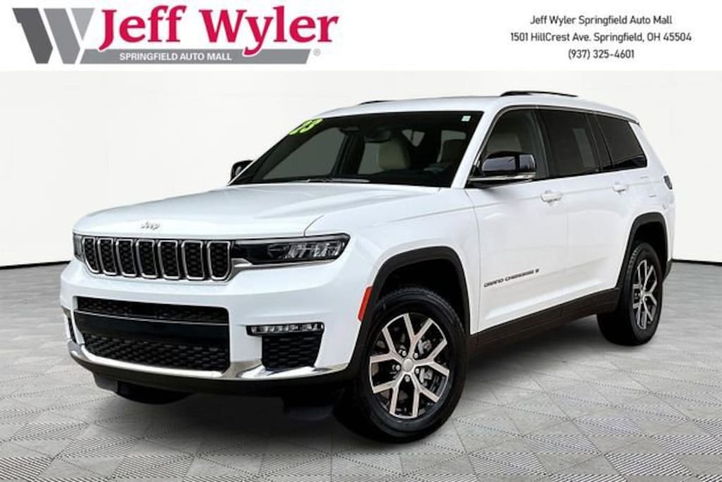 Jeff Wyler Springfield Auto Mall is pleased to offer this beautiful-looking 2023 Jeep Grand Cherokee L Limited in Bright White Clearcoat. Well equipped with: Quick Order Package 23E, 3.45 Rear Axle Ratio, 3rd row seats: split-bench, 4-Wheel Disc Brakes, 6 Speakers, ABS brakes, Active Noise Control System, Air Conditioning, Alloy wheels, AM/FM radio: SiriusXM with 360L, Anti-whiplash front head restraints, Audio memory, Auto High-beam Headlights, Automatic temperature control, Brake assist, Bumpers: body-color, Capri Leatherette Seats, Compass, Delay-off headlights, Driver door bin, Driver vanity mirror, Dual front impact airbags, Dual front side impact airbags, Electronic Stability Control, Emergency communication system, Four wheel independent suspension, Front anti-roll bar, Front Bucket Seats, Front Center Armrest w/Storage, Front dual zone A/C, Front fog lights, Front reading lights, Fully automatic headlights, Garage door transmitter, Heated door mirrors, Heated front seats, Heated rear seats, Heated steering wheel, Illuminated entry, Knee airbag, Low tire pressure warning, Manual Fold Seatbacks, Memory seat, Molded In Color Black/Gloss Black Roof Rails, Navigation System, Normal Duty Suspension, Occupant sensing airbag, Outside temperature display, Overhead airbag, Overhead console, Panic alarm, ParkView Rear Back-Up Camera, Passenger door bin, Passenger vanity mirror, Power door mirrors, Power driver seat, Power Liftgate, Power passenger seat, Power steering, Power windows, Radio data system, Radio: Uconnect 5 Nav w/10.1 Display, Rear air conditioning, Rear anti-roll bar, Rear reading lights, Rear window defroster, Rear window wiper, Reclining 3rd row seat, Remote keyless entry, Security system, Speed control, Speed-Sensitive Wipers, Split folding rear seat, Spoiler, Steering wheel mounted audio controls, Tachometer, Telescoping steering wheel, Tilt steering wheel, Traction control, Trip computer, Turn signal indicator mirrors, Variably intermittent wipers, Voltmeter, Wheels: 18 x 8.0 Fully Painted Aluminum, and Wheels: 18 x 8.0 Polished/Painted Aluminum. Ask about available certifications. Used vehicles 10 years of age or newer with less than 100,000 miles are eligible for the Wyler Assurance Program, but eligible vehicles must pass our reconditioning process and multi-point inspection. Provided the vehicle passes inspection, vehicles will be eligible for the 6 month/6,000 mile limited warranty. The 6 month/6,000 mile limited warranty is NOT available on AS-IS vehicles, wholesale vehicles, lease buyback/pass-thru vehicles or un-inspected vehicles. Note that this program can also apply to vehicles where the remaining factory coverage is less than 6 months or 6,000 miles. Please check the Federal Trade Commission (FTC) Buyers guide on the vehicle for full details as to whether or not warranty coverage may apply. Contact Dealer for additional details. The Wyler Assurance 6 month/6,000 Mile limited warranty ends 6 months from the date of the Retail Purchase Agreement (BUYERS ORDER) or when the vehicle's odometer registers 6,000 additional miles to the mileage listed on the BUYERS ORDER, whichever comes first. Your Deductible - The warranty holder on your contract pays the first $100 of each covered repair.