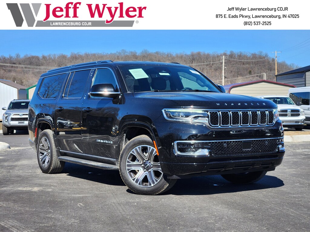 Jeff Wyler Chrysler Dodge Jeep of Lawrenceburg is excited to offer this great-looking 2025 Jeep Wagoneer L in Diamond Black Crystal Pearlcoat. Quick Order Package 25E, 10 Speakers, 118 MPH Maximum Speed Calibration, 3.55 Rear Axle Ratio, 3rd row seats: bench, 4-Wheel Disc Brakes, ABS brakes, Air Conditioning, Alloy wheels, AM/FM radio: SiriusXM with 360L, Anti-whiplash front head restraints, Apple CarPlay/Android Auto, Audio memory, Auto Adjust In Reverse Exterior Mirrors, Auto-dimming door mirrors, Auto-Dimming Exterior Driver Mirror, Auto-dimming Rear-View mirror, Auto-leveling suspension, Automatic temperature control, Brake assist, Bumpers: body-color, Compass, Delay-off headlights, Driver door bin, Driver vanity mirror, Driver's Seat Mounted Armrest, Dual front impact airbags, Dual front side impact airbags, Electronic Stability Control, Emergency communication system: Jeep Connect, Exterior Mirrors Approach Lamps, Exterior Mirrors w/Memory, Exterior Mirrors w/Supplemental Signals, Four wheel independent suspension, Front anti-roll bar, Front Bucket Seats, Front Center Armrest w/Storage, Front dual zone A/C, Front fog lights, Front License Plate Bracket, Front reading lights, Fully automatic headlights, Garage door transmitter, Heated door mirrors, Heated Exterior Mirrors, Heated front seats, Heated steering wheel, Illuminated entry, Knee airbag, Leather Trimmed Bucket Seats, Low tire pressure warning, Memory seat, Navigation System, Normal Duty Suspension, Occupant sensing airbag, Outside temperature display, Overhead airbag, Overhead console, Panic alarm, ParkView Rear Back-Up Camera, Passenger door bin, Passenger seat mounted armrest, Passenger vanity mirror, Power adjustable front head restraints, Power door mirrors, Power driver seat, Power Liftgate, Power passenger seat, Power steering, Power windows, Radio data system, Radio: Uconnect 5 Nav w/10.1" Display, Rear air conditioning, Rear anti-roll bar, Rear reading lights, Rear seat center armrest, Rear window defroster, Rear window wiper, Reclining 3rd row seat, Remote keyless entry, Security system, Speed control, Speed-sensing steering, Speed-Sensitive Wipers, Split folding rear seat, Steering wheel memory, Steering wheel mounted audio controls, Tachometer, Telescoping steering wheel, Tilt steering wheel, Traction control, Trip computer, Turn signal indicator mirrors, Variably intermittent wipers, Ventilated front seats, Voltmeter, and Wheels: 20" x 9.0" Premium 2 Aluminum Our PRE-OWNED vehicles are put through a rigorous 167- POINT QUALITY ASSURANCE INSPECTION along with an average amount of over $1,400.00 SPENT to recondition each vehicle so we can be sure to deliver you the highest quality vehicle like you deserve! ***ONLINE PRICE DOES NOT INCLUDE WYLER FAMILY FIRST PACKAGE*** Stop by 4136 Shelbyville Road to see for yourself, or give us a call @ 502-897-3151 to schedule your test drive! Ask about available certifications.