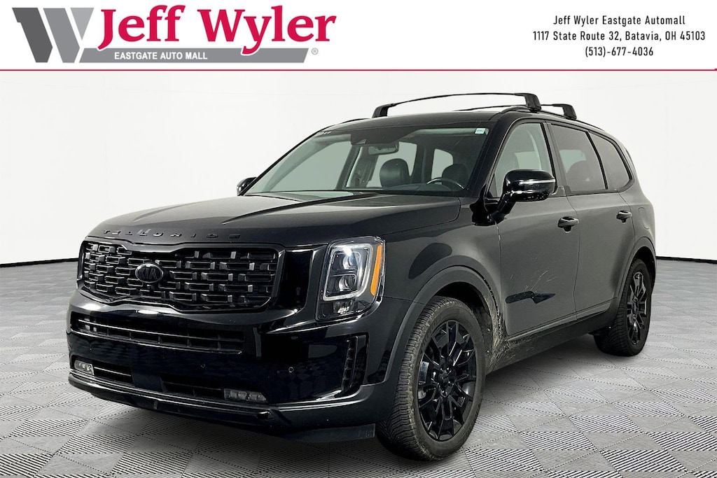 Jeff Wyler Eastgate Auto Mall is proud to offer this superb-looking 2021 Kia Telluride SX in Ebony Black. Well equipped with: Nightfall Edition Package (Black Finish Radiator Grille, Body Color Exterior Door Handles, Exclusive Black Fog Light Bezel, Exclusive Black Headlight Bezels, Front & Rear Gloss Black Finish Bumper Skid Plates, Front & Rear KIA Logo, Gloss Black Finish Exterior Emblems, Gloss Black Finish Front & Rear Door Garnish, Gloss Black Finish Roof Rails, and Wheels: 7.5" x 20" Exclusive Black Finish Alloy), SX Prestige Package (110V Inverter, Heads-Up Display, Heated & Ventilated 2nd Row Seats, Premium Cloth Headliner & Pillar Trim, Premium Nappa Leather Seat Trim, and Rain-Sensing Front Windshield Wipers), 10 Speakers, 3.648 Axle Ratio, 3rd row seats: split-bench, 4-Wheel Disc Brakes, ABS brakes, Air Conditioning, Alloy wheels, AM/FM radio: SiriusXM, Apple CarPlay & Android Auto, Auto High-beam Headlights, Auto-dimming Rear-View mirror, Automatic temperature control, Brake assist, Bumpers: body-color, Carpeted Floor Mats, Compass, Delay-off headlights, Driver door bin, Driver vanity mirror, Dual front impact airbags, Dual front side impact airbags, Electronic Stability Control, Emergency communication system: 911 Connect, Four wheel independent suspension, Front anti-roll bar, Front Bucket Seats, Front Center Armrest, Front dual zone A/C, Front fog lights, Front reading lights, Fully automatic headlights, Garage door transmitter: HomeLink, Heated & Ventilated Front Bucket Seats, Heated door mirrors, Heated front seats, Heated steering wheel, Illuminated entry, Knee airbag, Leather Seat Trim, Leather Shift Knob, Leather steering wheel, Low tire pressure warning, Memory seat, Navigation System, Occupant sensing airbag, Outside temperature display, Overhead airbag, Overhead console, Panic alarm, Passenger door bin, Passenger vanity mirror, Power door mirrors, Power driver seat, Power Liftgate, Power moonroof, Power passenger seat, Power steering, Power windows, Radio data system, Radio: AM/FM/SIRIUS Premium Audio, Rear air conditioning, Rear anti-roll bar, Rear audio controls, Rear reading lights, Rear window defroster, Rear window wiper, Reclining 3rd row seat, Remote keyless entry, Roof rack: rails only, Security system, Smart Key w/ Push Button and Remote Start, Speed control, Speed-sensing steering, Split folding rear seat, Spoiler, Steering wheel mounted audio controls, Tachometer, Telescoping steering wheel, Tilt steering wheel, Traction control, Trip computer, Turn signal indicator mirrors, Variably intermittent wipers, Ventilated front seats, and Wheels: 7.5" x 20" Black Finish Alloy. CARFAX One-Owner. Awards: * JD Power Initial Quality Study (IQS) * JD Power Automotive Performance, Execution and Layout (APEAL) Study, Initial Quality Study (IQS) Ask about available certifications. Used vehicles 10 years of age or newer with less than 100,000 miles are eligible for the Wyler Assurance Program, but eligible vehicles must pass our reconditioning process and multi-point inspection. Provided the vehicle passes inspection, vehicles will be eligible for the 6 month/6,000 mile limited warranty. The 6 month/6,000 mile limited warranty is NOT available on AS-IS vehicles, wholesale vehicles, lease buyback/pass-thru vehicles or un-inspected vehicles. Note that this program can also apply to vehicles where the remaining factory coverage is less than 6 months or 6,000 miles. Please check the Federal Trade Commission (FTC) Buyers guide on the vehicle for full details as to whether or not warranty coverage may apply. Contact Dealer for additional details. The Wyler Assurance 6 month/6,000 Mile limited warranty ends 6 months from the date of the Retail Purchase Agreement (BUYERS ORDER) or when the vehicle's odometer registers 6,000 additional miles to the mileage listed on the BUYERS ORDER, whichever comes first. Your Deductible - The warranty holder on your contract pays the first $100 of each covered repair.