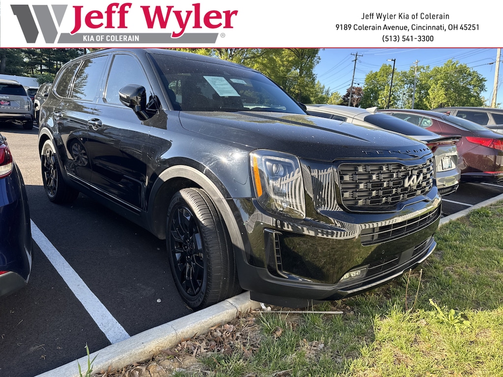Jeff Wyler Kia of Colerain is very proud to offer this fantastic 2022 Kia Telluride SX in Ebony Black. Nightfall Edition Package (Black Finish Radiator Grille, Body Color Exterior Door Handles, Exclusive Black Fog Light Bezel, Exclusive Black Headlight Bezels, Front & Rear Gloss Black Finish Bumper Skid Plates, Gloss Black Finish Exterior Emblems, Gloss Black Finish Front & Rear Door Garnish, Gloss Black Finish Roof Rails, and Wheels: 20" x 7.5" Exclusive Black Alloy), SX Prestige Package (110V Inverter, Heads-Up Display, Heated & Ventilated 2nd Row Seats, Premium Cloth Headliner & Pillar Trim, Premium Nappa Leather Seat Trim, and Rain-Sensing Front Windshield Wipers), Towing Package (Self Leveling Rear Suspension and Tow Hitch w/Harness (TOF)), 10 Speakers, 3.648 Axle Ratio, 3rd row seats: split-bench, 4-Wheel Disc Brakes, ABS brakes, Air Conditioning, Alloy wheels, AM/FM radio: SiriusXM, Apple CarPlay & Android Auto, Auto High-beam Headlights, Auto-dimming Rear-View mirror, Automatic temperature control, Brake assist, Bumpers: body-color, Carpeted Floor Mats, Compass, Delay-off headlights, Driver door bin, Driver vanity mirror, Dual front impact airbags, Dual front side impact airbags, Electronic Stability Control, Emergency communication system: 911 Connect, Four wheel independent suspension, Front anti-roll bar, Front Bucket Seats, Front Center Armrest, Front dual zone A/C, Front fog lights, Front reading lights, Fully automatic headlights, Garage door transmitter: HomeLink, harman/kardon® Speakers, Heated & Ventilated Front Bucket Seats, Heated door mirrors, Heated front seats, Heated steering wheel, Illuminated entry, Knee airbag, Leather Seat Trim, Leather Shift Knob, Leather steering wheel, Low tire pressure warning, Memory seat, Navigation System, Occupant sensing airbag, Outside temperature display, Overhead airbag, Overhead console, Panic alarm, Passenger door bin, Passenger vanity mirror, Power door mirrors, Power driver seat, Power Liftgate, Power moonroof, Power passenger seat, Power steering, Power windows, Radio data system, Radio: AM/FM harman/kardon Audio System, Rear air conditioning, Rear anti-roll bar, Rear audio controls, Rear reading lights, Rear window defroster, Rear window wiper, Reclining 3rd row seat, Remote keyless entry, Roof rack: rails only, Security system, Smart Key w/ Push Button and Remote Start, Speed control, Speed-sensing steering, Split folding rear seat, Spoiler, Steering wheel mounted audio controls, SX Dune Brown Nappa Leather Seats, Tachometer, Telescoping steering wheel, Tilt steering wheel, Traction control, Trip computer, Turn signal indicator mirrors, Variably intermittent wipers, Ventilated front seats, and Wheels: 20" x 7.5" Black Alloy Our PRE-OWNED vehicles are put through a rigorous 167- POINT QUALITY ASSURANCE INSPECTION along with an average amount of over $1,400.00 SPENT to recondition each vehicle so we can be sure to deliver you the highest quality vehicle like you deserve! ***ONLINE PRICE DOES NOT INCLUDE WYLER FAMILY FIRST PACKAGE***