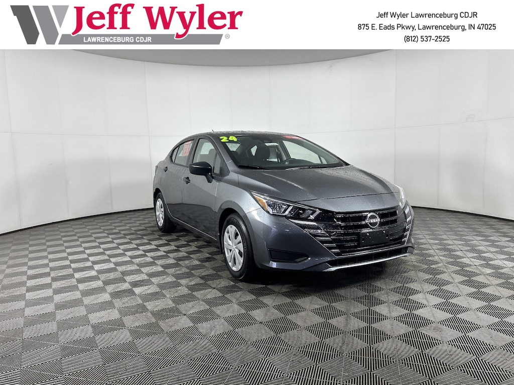 Jeff Wyler Chrysler Dodge Jeep of Lawrenceburg is delighted to offer this good-looking 2024 Nissan Versa 1.6 S in Gun Metallic. Trunk Package (Shopping Bag Hooks and Trunk Net), 15" Steel Wheels w/Full Wheel Covers, 4 Speakers, ABS brakes, Air Conditioning, AM/FM radio, Armrest, Auto High-beam Headlights, Brake assist, Bumpers: body-color, Carpeted Floor Mats, Cloth Seat Trim, Driver door bin, Driver vanity mirror, Dual front impact airbags, Dual front side impact airbags, Electronic Stability Control, Front anti-roll bar, Front Bucket Seats, Front reading lights, Front wheel independent suspension, Fully automatic headlights, Illuminated entry, Knee airbag, Low tire pressure warning, Occupant sensing airbag, Outside temperature display, Overhead airbag, Panic alarm, Passenger door bin, Passenger vanity mirror, Power door mirrors, Power steering, Power windows, Radio data system, Radio: AM/FM Audio System, Rear Parking Sensors, Rear side impact airbag, Rear window defroster, Speed control, Splash Guards, Steering wheel mounted audio controls, Tachometer, Telescoping steering wheel, Tilt steering wheel, Traction control, Trip computer, and Variably intermittent wipers Our PRE-OWNED vehicles are put through a rigorous 167- POINT QUALITY ASSURANCE INSPECTION along with an average amount of over $1,400.00 SPENT to recondition each vehicle so we can be sure to deliver you the highest quality vehicle like you deserve! ***ONLINE PRICE DOES NOT INCLUDE WYLER FAMILY FIRST PACKAGE*** Stop by 4136 Shelbyville Road to see for yourself, or give us a call @ 502-897-3151 to schedule your test drive! Ask about available certifications.