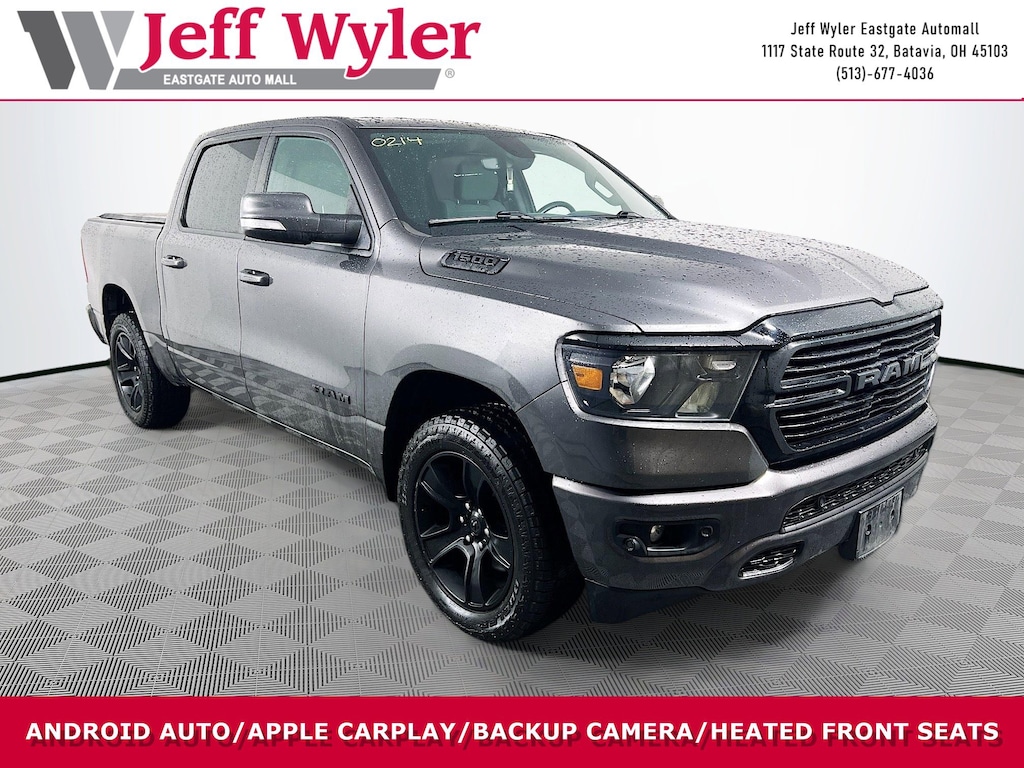 Jeff Wyler Eastgate Auto Mall is excited to offer this outstanding 2020 Ram 1500 Big Horn/Lone Star in Granite Crystal Metallic Clearcoat. Well equipped with: Big Horn Level 2 Equipment Group (115V Auxiliary Power Outlet, 115V Auxiliary Rear Power Outlet, 2 USB Full Function/Charge Only Media Hub, 2nd Row In Floor Storage Bins, 400W Inverter, Air Conditioning ATC w/Dual Zone Control, Auto-Dimming Rear-View Mirror, Big Horn IP Badge, Black Premium Power Mirrors, Class IV Receiver Hitch, Dampened Tailgate, Foam Bottle Insert (Door Trim Panel), Glove Box Lamp, Heated Front Seats, Heated Steering Wheel, ParkSense Front/Rear Park Assist w/Stop, Power 4-Way Driver Lumbar Adjust, Power 8-Way Driver Seat, Power Adjustable Pedals, Radio: Uconnect 4 w/8.4" Display, Rear Dome w/On/Off Switch Lamp, Rear Power Sliding Window, Rear Window Defroster, Security Alarm, SiriusXM Satellite Radio, Sun Visors w/Illuminated Vanity Mirrors, and Universal Garage Door Opener), Night Edition (3 Rear Seat Head Restraints, 4 Way Front Headrests, Anti-Spin Differential Rear Axle, Auto-Dimming Exterior Driver Mirror, Black Exterior Truck Badging, Black Headlamp Bezels, Black Interior Accents, Body Color Door Handles, Body Color Exterior Mirrors, Body Color Front Bumper, Body Color Premium Power Mirrors, Body Color Rear Bumper w/Step Pads, Bucket Seats, Deluxe Cloth Bucket Seats, Dual Exhaust w/Black Tips, Exterior Mirrors Courtesy Lamps, Exterior Mirrors w/Memory, Front Seat Back Map Pockets, Full Length Floor Console, Grille Surround 1 Black Texture 2 Black, Manual Adjust 4-Way Front Passenger Seat, Power-Folding Mirrors, Rear 60/40 Folding Seat, and Wheels: 20" x 9.0" Premium Paint/Polished), Quick Order Package 25Z Big Horn (Big Horn Badge), 3.21 Rear Axle Ratio, 4-Wheel Disc Brakes, 48V Belt Starter Generator, 6 Speakers, ABS brakes, Air Conditioning, Alloy wheels, AM/FM radio, Brake assist, Bumpers: chrome, Cloth Bench Seat, Compass, Delay-off headlights, Driver door bin, Dual front impact airbags, Dual front side impact airbags, Electronic Stability Control, Front anti-roll bar, Front Center Armrest w/Storage, Front fog lights, Front reading lights, Front wheel independent suspension, Fully automatic headlights, GPS Antenna Input, Heated door mirrors, Illuminated entry, Leather steering wheel, Low tire pressure warning, Manufacturer's Statement of Origin, Occupant sensing airbag, Outside temperature display, Overhead airbag, Overhead console, Panic alarm, ParkView Rear Back-Up Camera, Passenger door bin, Passenger vanity mirror, Power door mirrors, Power steering, Power windows, Radio data system, Radio: Uconnect 3 w/5" Display, Rear anti-roll bar, Rear seat center armrest, Rear step bumper, Rear Wheelhouse Liners, Remote keyless entry, Remote Start System, Speed control, Split folding rear seat, Steering wheel mounted audio controls, Tachometer, Telescoping steering wheel, Tilt steering wheel, Traction control, Trip computer, Variably intermittent wipers, Voltmeter, and Wheels: 18" x 8" Cast-Aluminum Painted. CARFAX One-Owner. Ask about available certifications. Used vehicles 10 years of age or newer with less than 100,000 miles are eligible for the Wyler Assurance Program, but eligible vehicles must pass our reconditioning process and multi-point inspection. Provided the vehicle passes inspection, vehicles will be eligible for the 6 month/6,000 mile limited warranty. The 6 month/6,000 mile limited warranty is NOT available on AS-IS vehicles, wholesale vehicles, lease buyback/pass-thru vehicles or un-inspected vehicles. Note that this program can also apply to vehicles where the remaining factory coverage is less than 6 months or 6,000 miles. Please check the Federal Trade Commission (FTC) Buyers guide on the vehicle for full details as to whether or not warranty coverage may apply. Contact Dealer for additional details. The Wyler Assurance 6 month/6,000 Mile limited warranty ends 6 months from the date of the Retail Purchase Agreement (BUYERS ORDER)