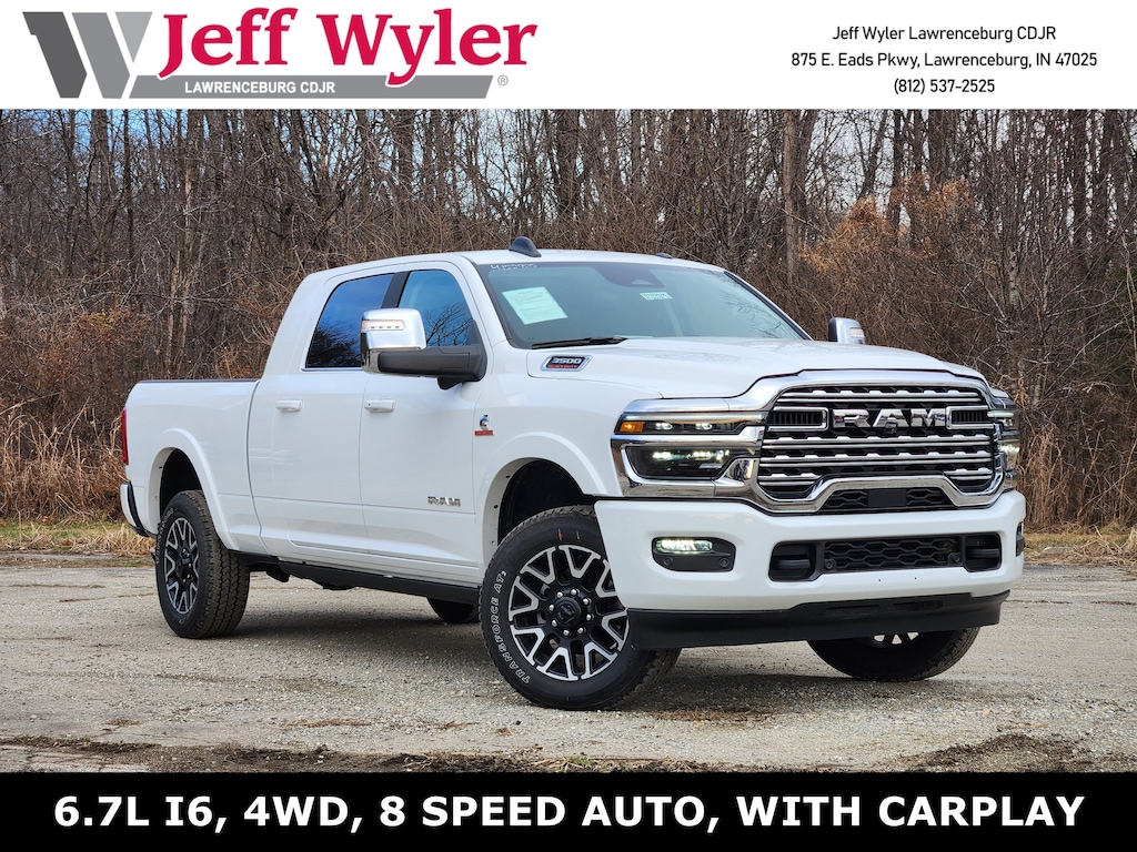 Jeff Wyler Chrysler Dodge Jeep of Lawrenceburg is pleased to offer this good-looking 2025 Ram 3500 Limited in Bright White Clearcoat. 5th Wheel/Gooseneck Towing Prep Group (Pickup Box, Vendor Painted Cargo Box, and Vendor Painted Cargo Box Tracking), Longhorn Level 1 Equipment Group (Active Lane Management System, Adaptive Steering System, Center Stop Lamp w/Cargo View Camera, Digital Rearview Mirror, Drowsy Driver Detection, LED Bed Lighting, MOPAR Spray In Bedliner, Power Deployable Running Boards, Surround View Camera System, Traffic Sign Recognition, Trailer Reverse Guidance, and Trailer Tire Pressure Monitoring System), Quick Order Package 24K Longhorn (Longhorn Instrument Cluster Theme 3), Tow-Mode Digital Rearview Mirror Package (Tow-Mode Camera (Wired)), 115V Auxiliary Rear Power Outlet, 17 Speakers, 2 Way Rear Headrest Seat, 3.42 Axle Ratio, 4 Way Front Headrests, 4-Wheel Disc Brakes, ABS brakes, Adjustable pedals, Air Conditioning, Alloy wheels, AM/FM radio: SiriusXM with 360L, Apple CarPlay/Android Auto, Audio memory, Auto High-beam Headlights, Auto-dimming door mirrors, Auto-dimming Rear-View mirror, Automatic temperature control, Black Wheel Center Hub, Bodyside moldings, Brake assist, Bucket Seats, Bumpers: body-color, Compass, Delay-off headlights, Driver door bin, Driver vanity mirror, Dual front impact airbags, Dual front side impact airbags, Dual Wireless Charging Pad, Electronic Stability Control, Front anti-roll bar, Front Bucket Seats, Front Center Armrest w/Storage, Front dual zone A/C, Front fog lights, Front reading lights, Front Seat Back Map Pockets, Full Length Premium Upgraded Floor Console, Fully automatic headlights, Garage door transmitter, Genuine wood console insert, Genuine wood dashboard insert, Genuine wood door panel insert, harman/kardon® Speakers, Heated door mirrors, Heated Front Seats, Heated front seats, Heated rear seats, Heated Second Row Seats, Heated Steering Wheel, Heated steering wheel, High Back Seats, Illuminated entry, Leather steering wheel, Low tire pressure warning, Memory seat, Navigation System, Occupant sensing airbag, Outside temperature display, Overhead airbag, Overhead console, Panic alarm, ParkView Rear Back-Up Camera, Passenger door bin, Passenger vanity mirror, Pedal memory, Power 2-Way Driver Lumbar Adjust, Power 2-Way Passenger Lumbar Adjust, Power Adjust 8-Way Driver Seat, Power Adjust 8-Way Front Passenger Seat, Power door mirrors, Power driver seat, Power passenger seat, Power steering, Power windows, Radio data system, Radio: Uconnect 5 Nav w/14.4" Display, Radio/Driver Seat/Mirrors/Pedals Memory, Rain sensing wipers, Rear 60/40 Folding Seat, Rear reading lights, Rear seat center armrest, Rear step bumper, Rear window defroster, Remote keyless entry, Security system, Speed control, Split folding rear seat, Steering wheel mounted audio controls, Tachometer, Tilt steering wheel, Traction control, Trip computer, Turn signal indicator mirrors, Ultra Premium Leather Seats, Variably intermittent wipers, Ventilated Front Seats, Ventilated front seats, Voltmeter, and Wheels: 20" x 8" Diamond Cut Aluminum Our PRE-OWNED vehicles are put through a rigorous 167- POINT QUALITY ASSURANCE INSPECTION along with an average amount of over $1,400.00 SPENT to recondition each vehicle so we can be sure to deliver you the highest quality vehicle like you deserve! ***ONLINE PRICE DOES NOT INCLUDE WYLER FAMILY FIRST PACKAGE*** Stop by 4136 Shelbyville Road to see for yourself, or give us a call @ 502-897-3151 to schedule your test drive! Ask about available certifications.