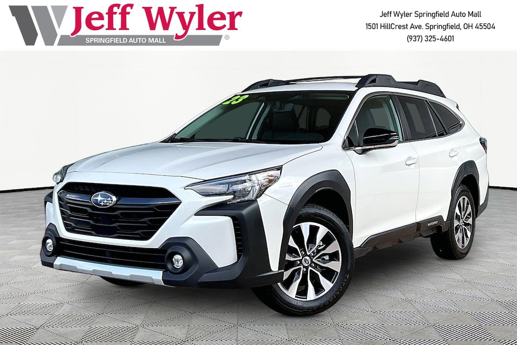 Jeff Wyler Springfield Auto Mall is pumped up to offer this wonderful 2023 Subaru Outback Limited in Crystal White Pearl. Well equipped with: Standard Model, 12 Speakers, 3.90 Axle Ratio, 4-Wheel Disc Brakes, ABS brakes, Air Conditioning, Alloy wheels, AM/FM radio: SiriusXM, Auto High-beam Headlights, Auto-dimming Rear-View mirror, Automatic temperature control, Brake assist, Bumpers: body-color, Compass, Driver door bin, Driver vanity mirror, Dual front impact airbags, Dual front side impact airbags, Electronic Stability Control, Emergency communication system: STARLINK Safety Plus (3-year free trial), Exterior Parking Camera Rear, Four wheel independent suspension, Front anti-roll bar, Front Bucket Seats, Front Center Armrest w/Storage, Front dual zone A/C, Front fog lights, Front reading lights, Fully automatic headlights, Garage door transmitter: HomeLink, harman/kardon® Speakers, Heated door mirrors, Heated Front Bucket Seats, Heated front seats, Heated rear seats, Illuminated entry, Knee airbag, Leather Shift Knob, Leather steering wheel, Low tire pressure warning, Memory seat, Occupant sensing airbag, Outside temperature display, Overhead airbag, Overhead console, Panic alarm, Passenger door bin, Passenger vanity mirror, Perforated Leather-Trimmed Upholstery, Power door mirrors, Power driver seat, Power Liftgate, Power passenger seat, Power steering, Power windows, Radio: Subaru STARLINK 11.6" Multimedia Plus Sys, Rear anti-roll bar, Rear seat center armrest, Rear window defroster, Rear window wiper, Remote keyless entry, Roof rack, Security system, Speed control, Speed-sensing steering, Split folding rear seat, Spoiler, Steering wheel mounted audio controls, Steering Wheel Paddle Shift Control Switches, Tachometer, Telescoping steering wheel, Tilt steering wheel, Traction control, Trip computer, Turn signal indicator mirrors, Variably intermittent wipers, and Wheels: 18" x 7J Black Aluminum Alloy. Ask about available certifications. Used vehicles 10 years of age or newer with less than 100,000 miles are eligible for the Wyler Assurance Program, but eligible vehicles must pass our reconditioning process and multi-point inspection. Provided the vehicle passes inspection, vehicles will be eligible for the 6 month/6,000 mile limited warranty. The 6 month/6,000 mile limited warranty is NOT available on AS-IS vehicles, wholesale vehicles, lease buyback/pass-thru vehicles or un-inspected vehicles. Note that this program can also apply to vehicles where the remaining factory coverage is less than 6 months or 6,000 miles. Please check the Federal Trade Commission (FTC) Buyers guide on the vehicle for full details as to whether or not warranty coverage may apply. Contact Dealer for additional details. The Wyler Assurance 6 month/6,000 Mile limited warranty ends 6 months from the date of the Retail Purchase Agreement (BUYERS ORDER) or when the vehicle's odometer registers 6,000 additional miles to the mileage listed on the BUYERS ORDER, whichever comes first. Your Deductible - The warranty holder on your contract pays the first $100 of each covered repair.